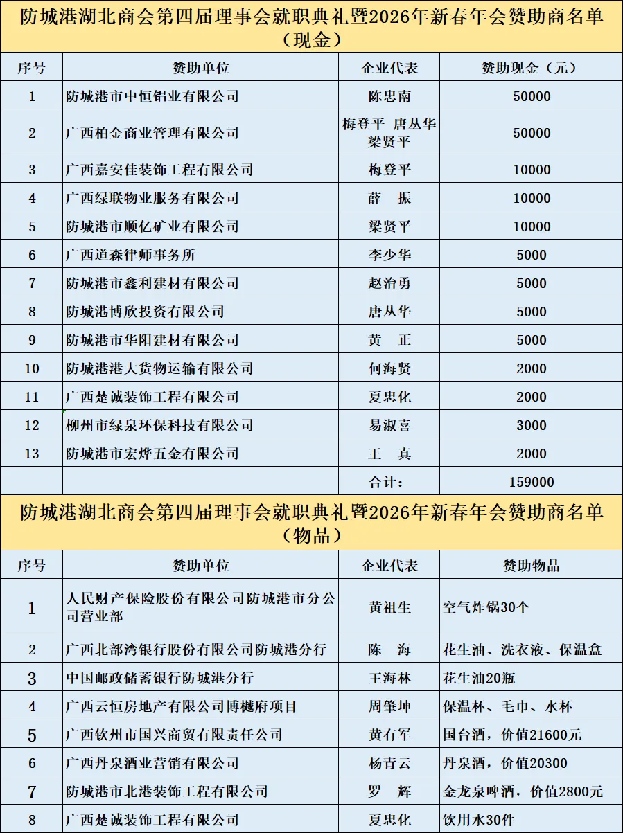 感谢防城港市中恒铝业有限公司与广西柏金商业管理有限公司的现金大力赞助!两家企业或扎根港城深耕实业,或由商会会员团结创新携手成立,始终与商会同心同行、荣辱与共,以真金白银的硬核支持为本次年会的顺利举办提供了坚实的资金保障,用实际行动诠释了楚商“抱团发展、共担共赢”的凝聚力与责任感,为年会各项环节的圆满落地做出了重要贡献,这份担当与情怀让全体楚商倍感振奋与自豪。
