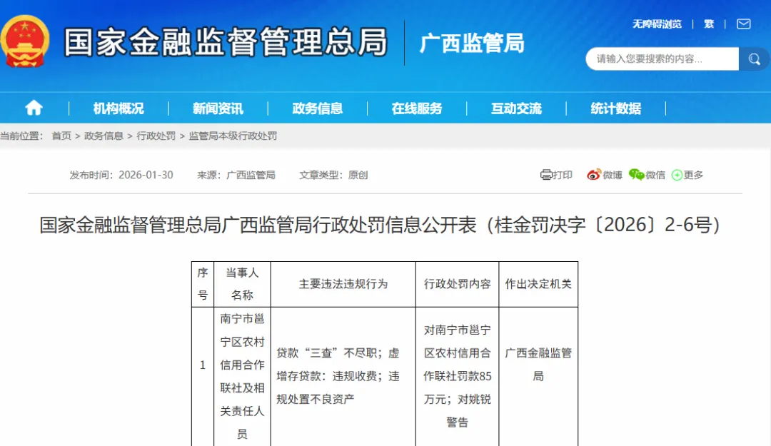 近日,国家金融监督管理总局广西监管局发布的行政处罚信息公开表显示: