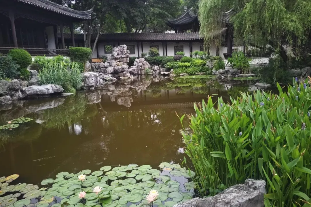中心是一汪平静的池塘,水面如镜,倒映着周围的建筑与绿树,形成虚实相生的镜像效果。池中点缀着睡莲与浮萍,增添了自然野趣。睡莲,也称子午莲、水芹花,是水生花卉中的名贵观赏花卉。它们喜欢在通风良好、强光的环境下盛开,所以睡莲在晚上花朵会闭合,到早上又会张开,仿佛在与晨光对话。