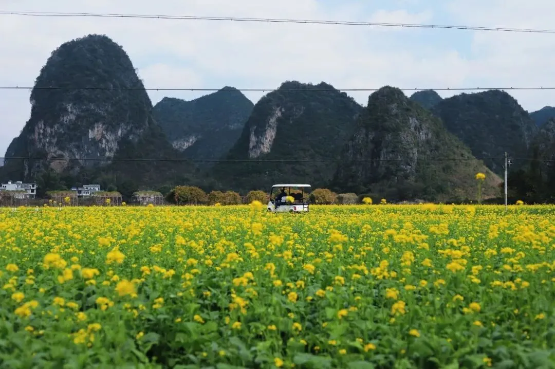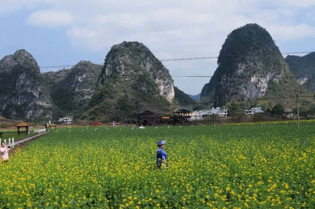 游客们身着绚丽的民族服饰,在花丛中翩翩起舞,艳丽的服饰与金黄的油菜花相互交织,形成了一道独特的风景线。
