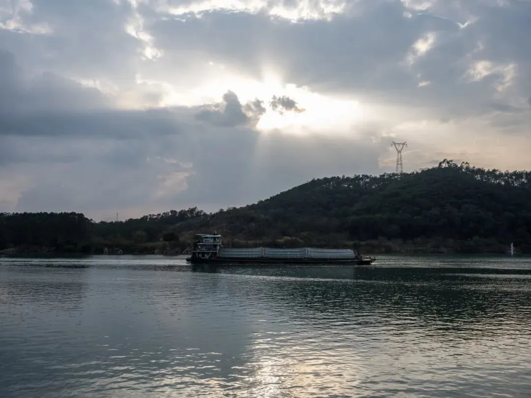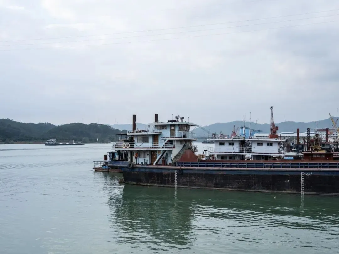 南宁港六景港区,过街天桥上的村民和远处邕江上的货船