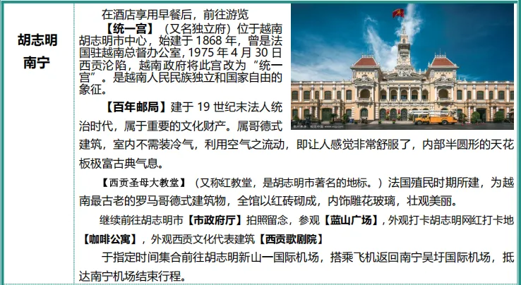 统一宫始建于1868年,曾是法国驻越南总督办公室,当时称“诺罗敦宫”,在越南战争时期被战火破坏,后经重建成为越南共和国的总统官邸,称为“独立宫”,1975年4月30日西贡沦陷,南越南共和国改此宫为“统一宫”。