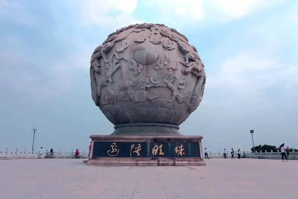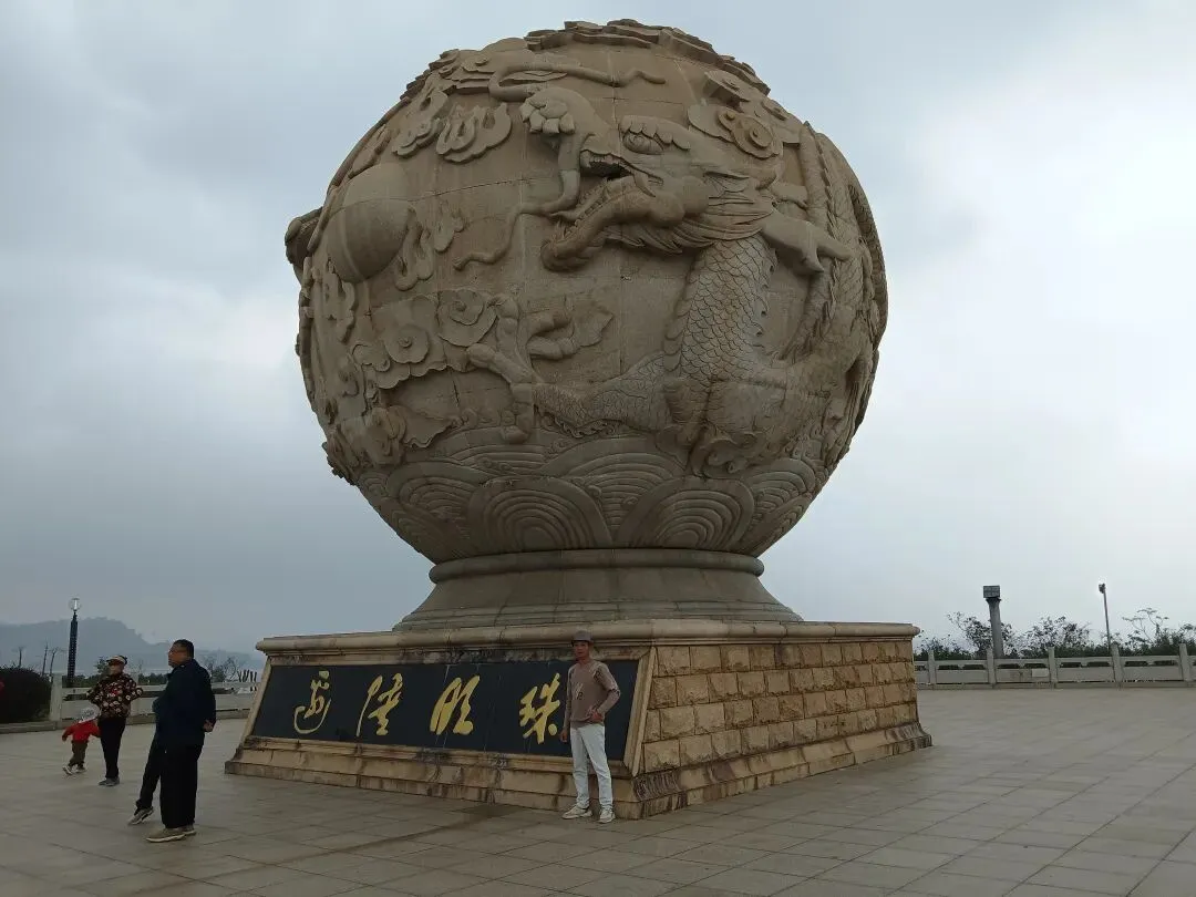 “边陲明珠”就矗立在明珠广场中心,通体银白如巨大珍珠。高达12.88米,球体表面雕刻海浪、渔船和双龙腾飞,是防城港地标及“边陲明珠”辉煌荣耀的象征。广场上游客不多,或拍照,或观景。