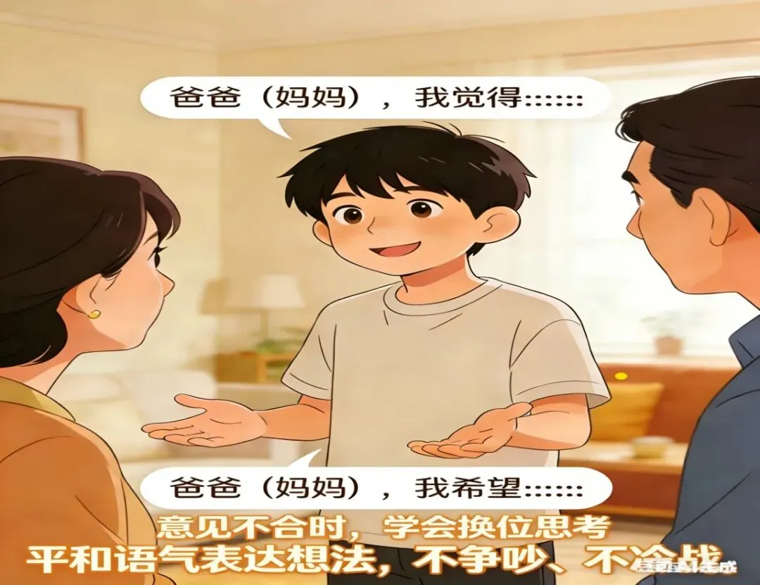 当意见不合时,学会换位思考,用“爸爸(妈妈),我觉得……”“爸爸(妈妈),我希望……”的平和语气表达想法,不争吵、不冷战。