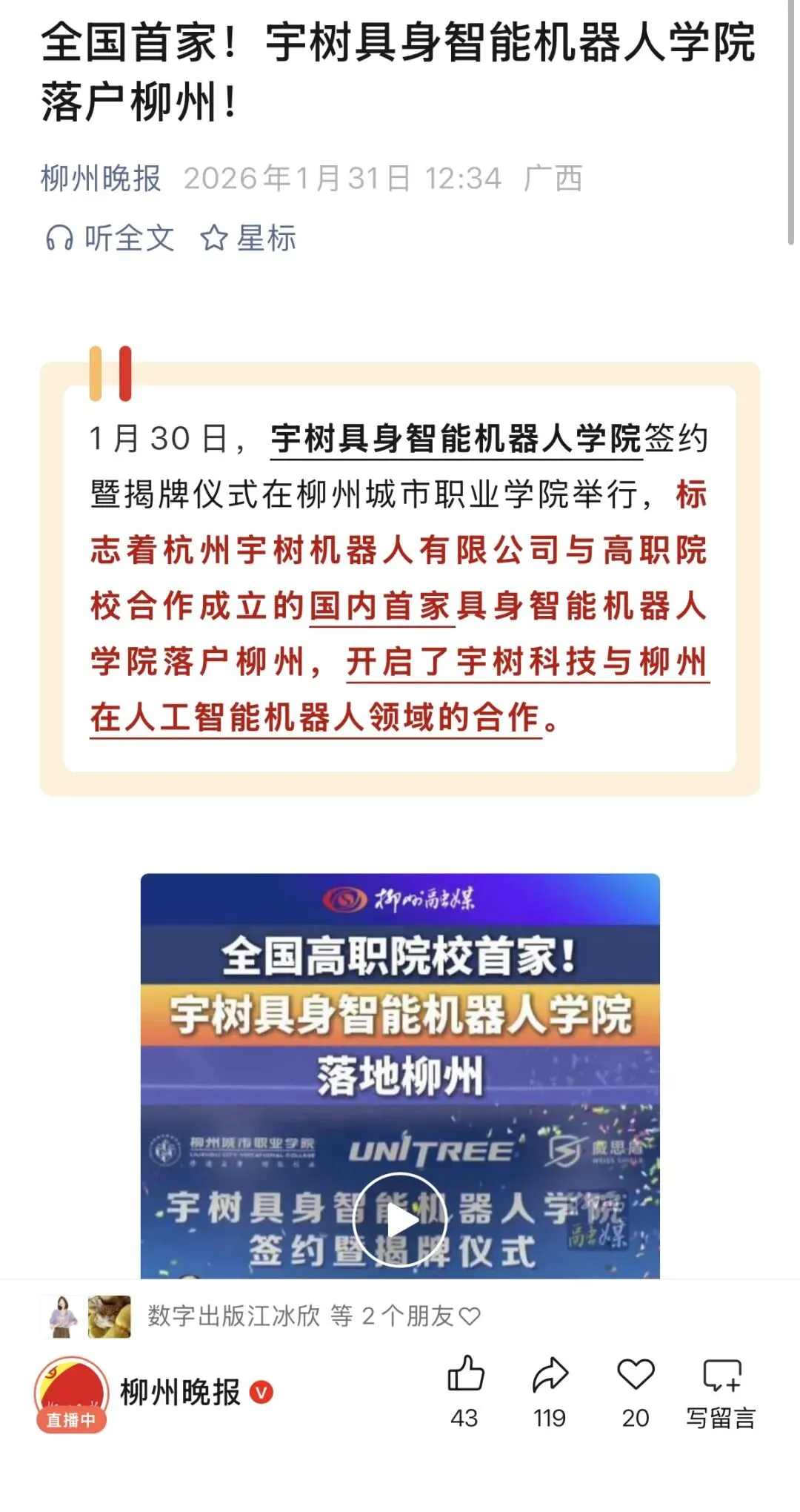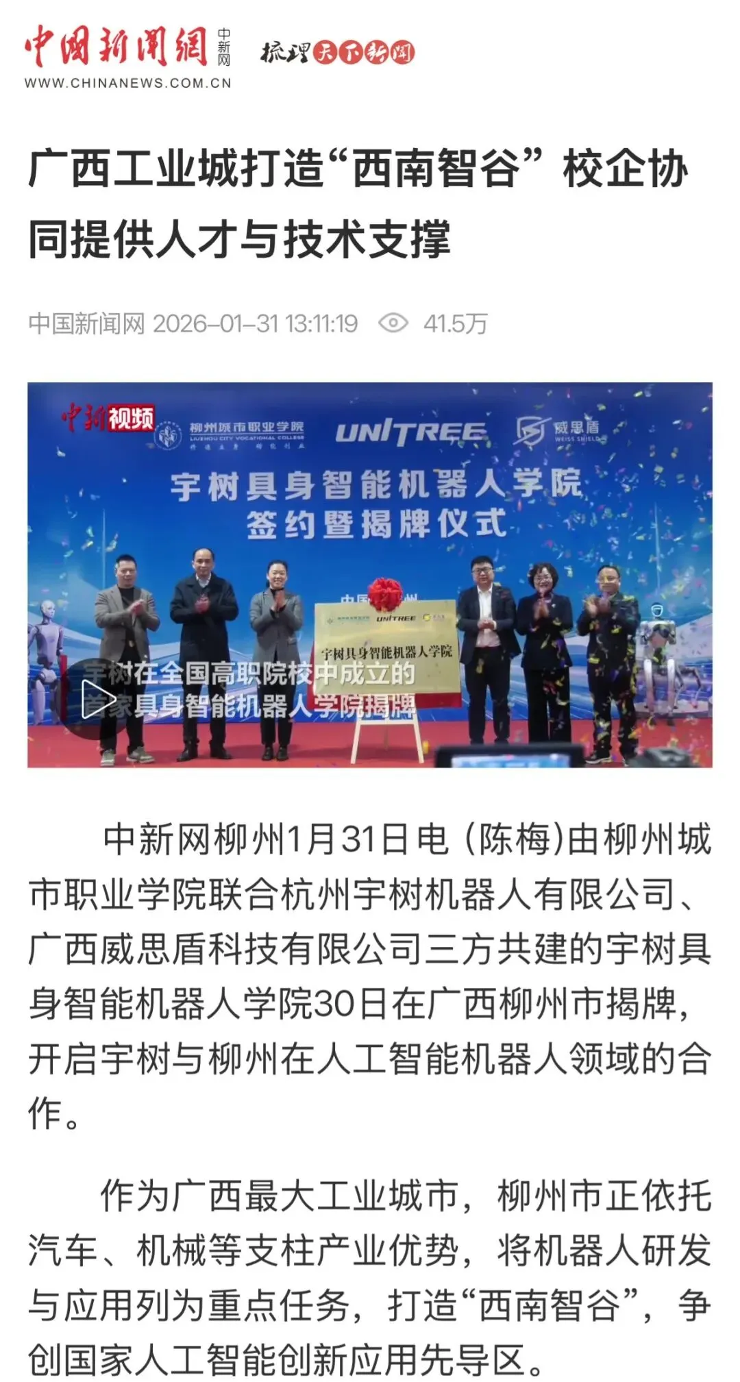 由柳州城市职业学院联合杭州宇树机器人有限公司、广西威思盾科技有限公司三方共建的宇树具身智能机器人学院30日在广西柳州市揭牌,开启宇树与柳州在人工智能机器人领域的合作。