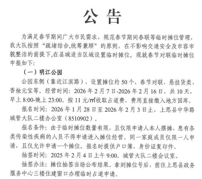 【防城港】关于临时设立2026年春节对联销售摊点的公告