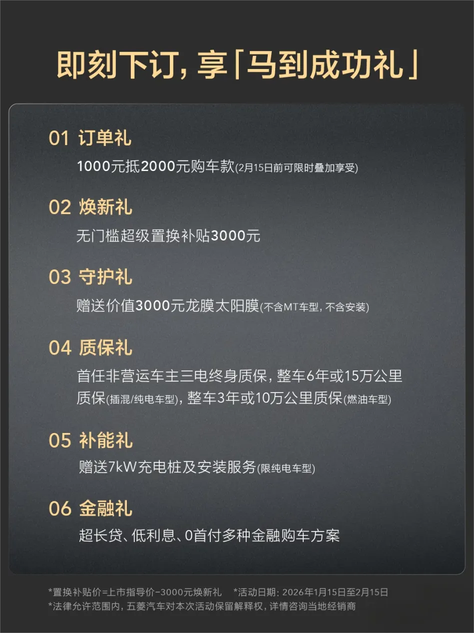 星光560上市指导价7.10万元起,现推出“马到成功礼”:2月15日前下订享1000元抵2000元购车款;享 3000 元无门槛超级置换补贴;赠价值3000元龙膜太阳膜(不含 MT 车型、不含安装);首任非营运车主享三电终身质保,插混 / 纯电版整车 6 年或 15 万公里质保、燃油版整车3年或10万公里质保;纯电车型赠7kW充电桩及安装服务;更有超长贷、低利息、0首付等多种金融方案可选。