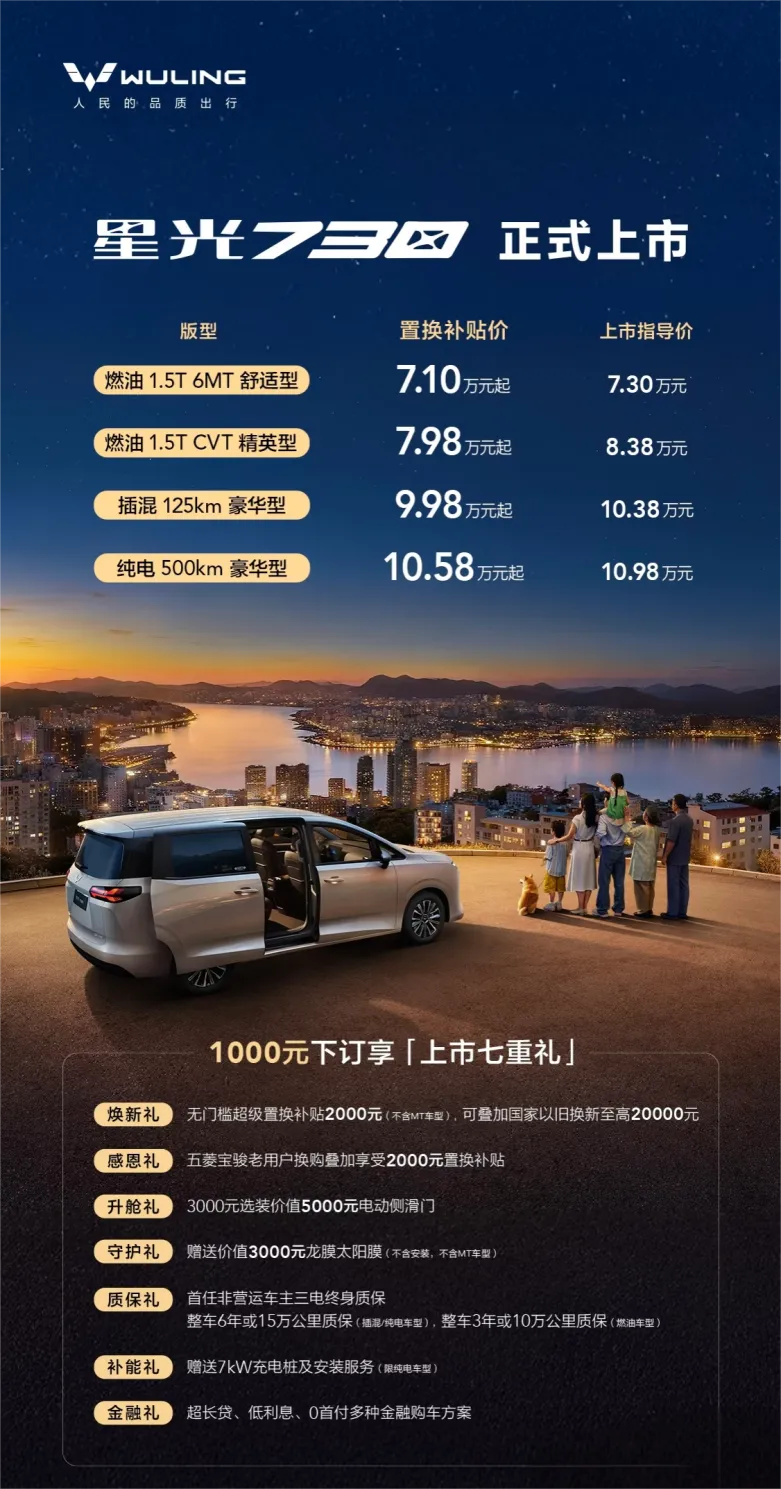 星光 730 同步推出1000 元下订享「上市七重礼」:享 2000 元无门槛超级置换补贴(不含 MT 车型,可叠加国家以旧换新至高 20000 元);五菱宝骏老用户换购叠加享 2000 元置换补贴;3000 元选装价值 5000 元电动滑移门;赠价值 3000 元龙膜太阳膜(不含安装、不含 MT 车型);首任非营运车主三电终身质保,插混 / 纯电版整车 6 年或 15 万公里质保、燃油版整车 3 年或 10 万公里质保;纯电车型赠 7kW 充电桩及安装服务;提供超长贷、低利息、0 首付等多种金融方案可选。
