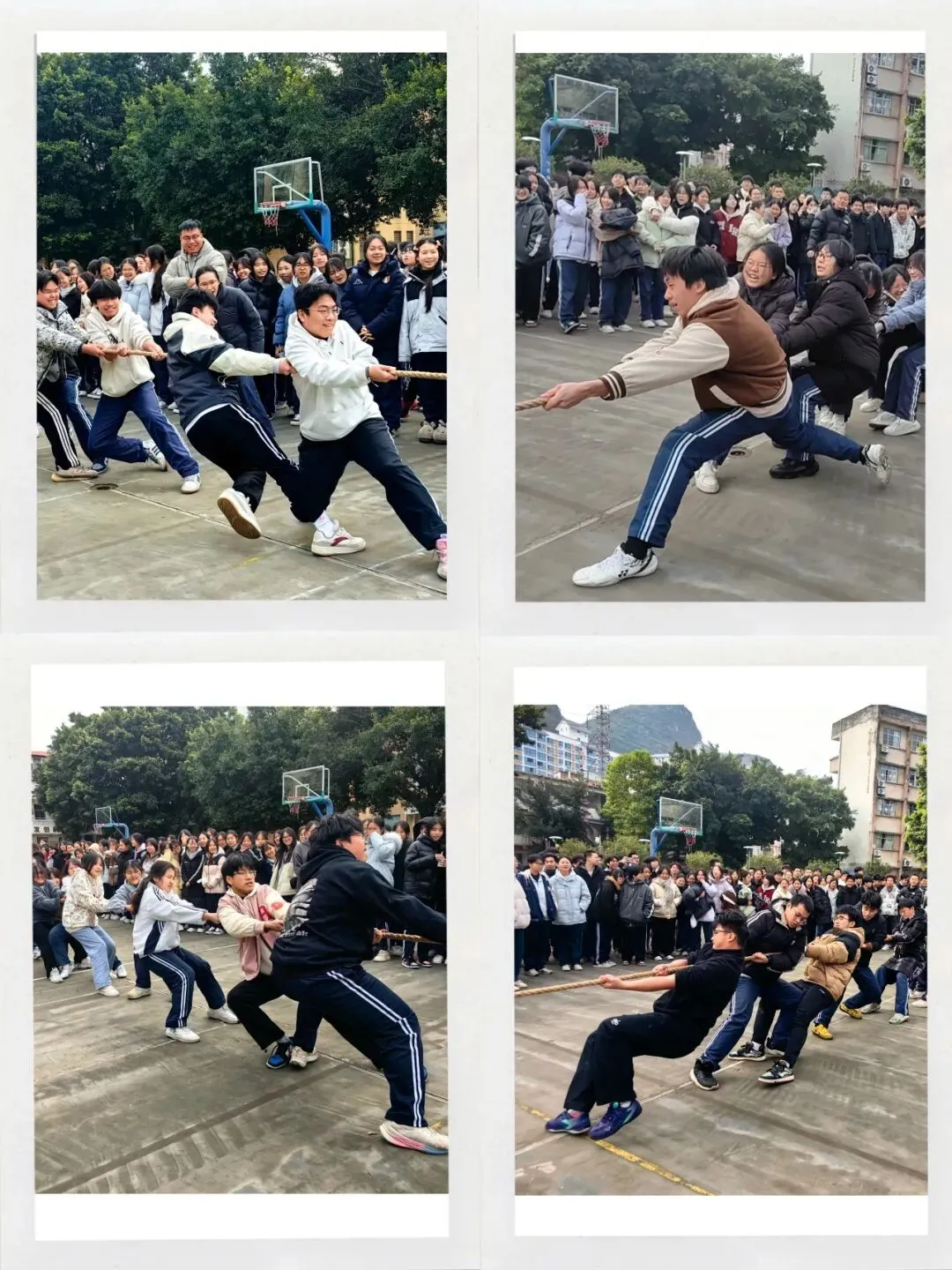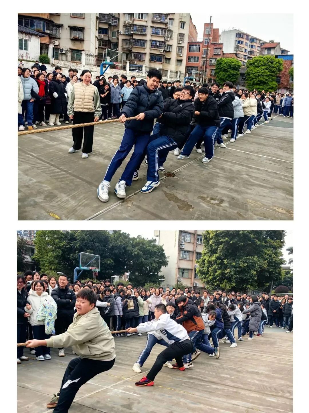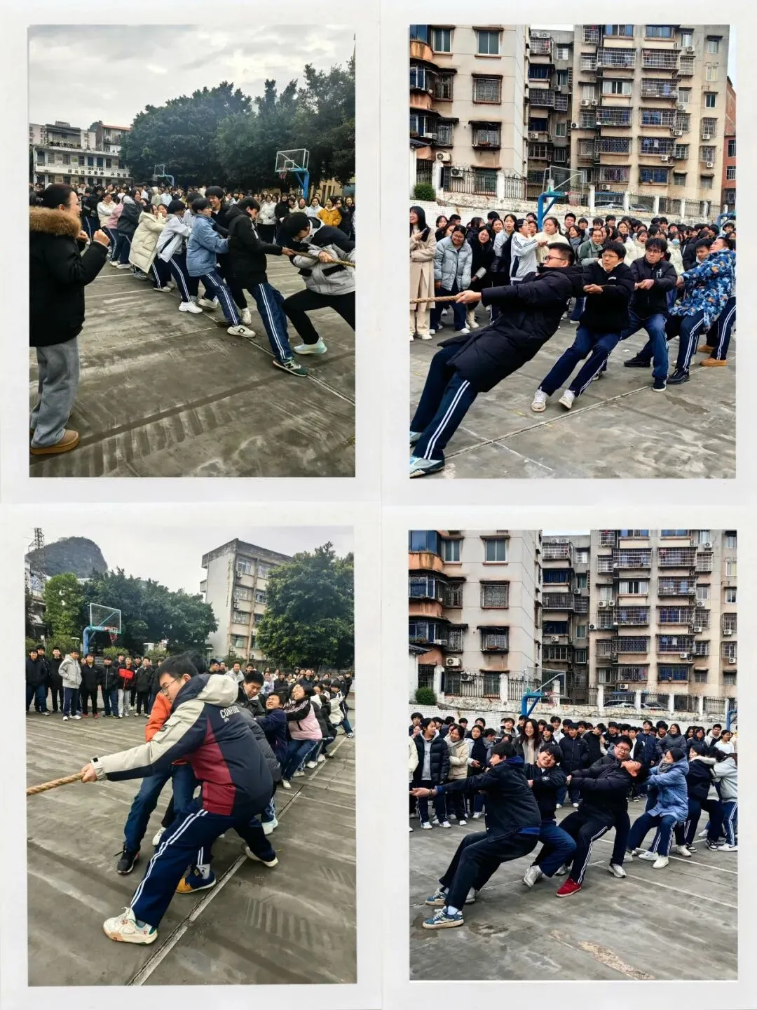冬日的暖阳洒在操场上,高三学子暂时放下书本,齐聚操场。比赛以班级为单位,采用三局两胜淘汰制,高三年级20个班级参与角逐。随着裁判员一声哨响,赛场上瞬间沸腾。对阵双方队员紧握长绳,身体后倾,双脚蹬地,齐声高喊“一二、一二”的口号,将全部力量凝聚于绳上。绳子中点的红绸带来回移动,每一次拉锯都牵动着在场所有人的心。