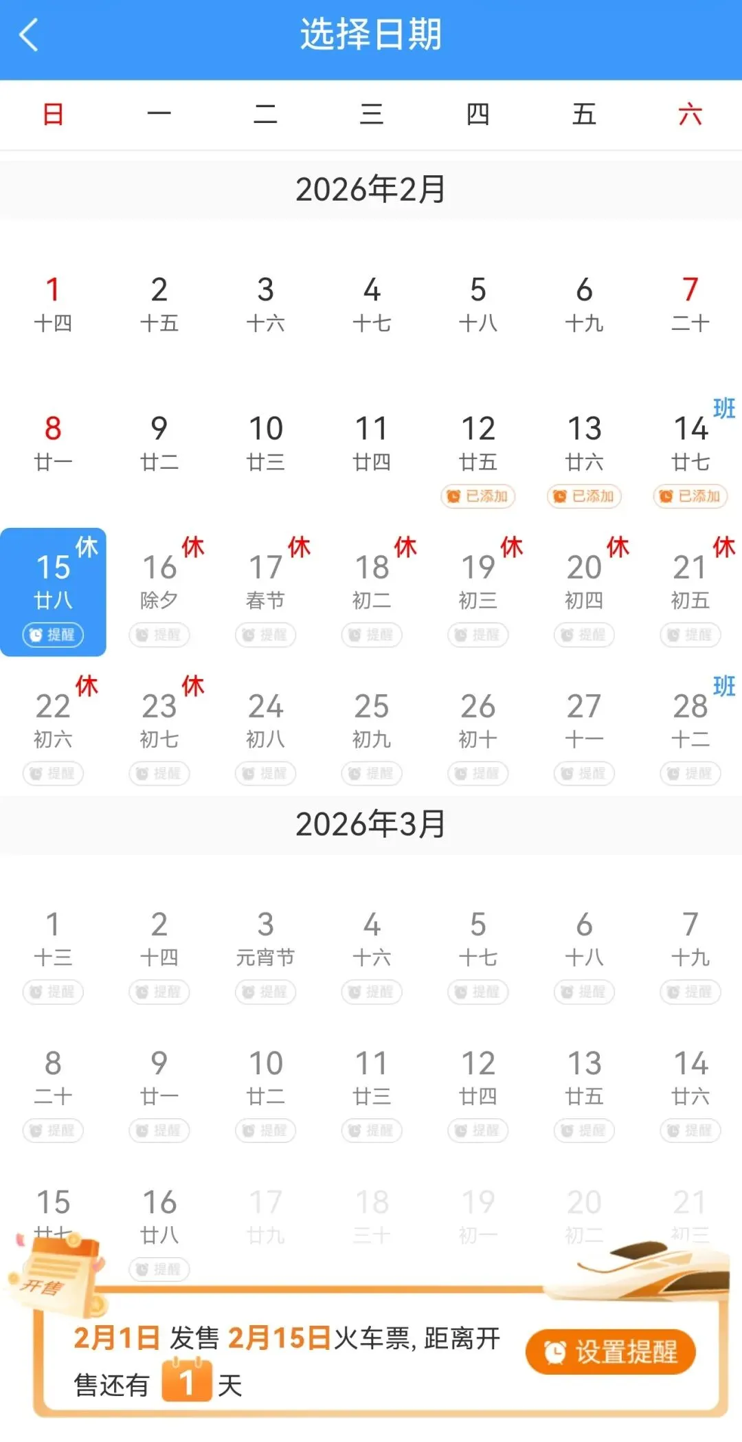 按照火车票提前15天售票的规定,明天(2月1日)可以购买春节假期首日(2月15日)的火车票,记得定好闹钟,准时锁定!
