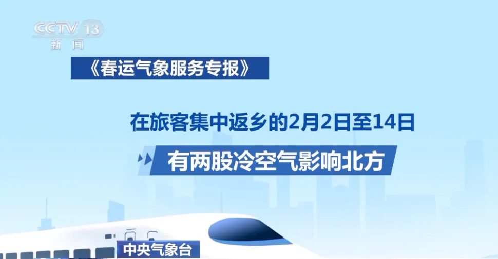 春运期间,我国天气整体特征为冷暖起伏较大,降水北多南少。《春运气象服务专报》指出,在旅客集中返乡的2月2日至14日,有两股冷空气影响北方: