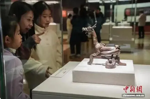 图为参观者在“帝国南疆——西汉南越国历史文化展”观看由一龙二蛇三蛙组成的蟠龙鎏金铜托座。南宁市博物馆副馆长覃忠介绍,从一座新馆起步,经过十年发展,目前该馆馆藏总量达2.5万余件,较2016年增长132.63%,逐步构建起反映南宁历史脉络、彰显区域文化特色的藏品体系。