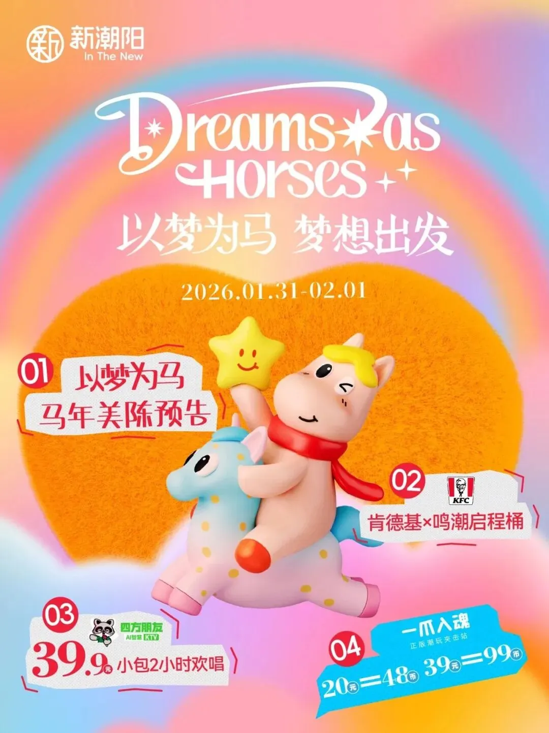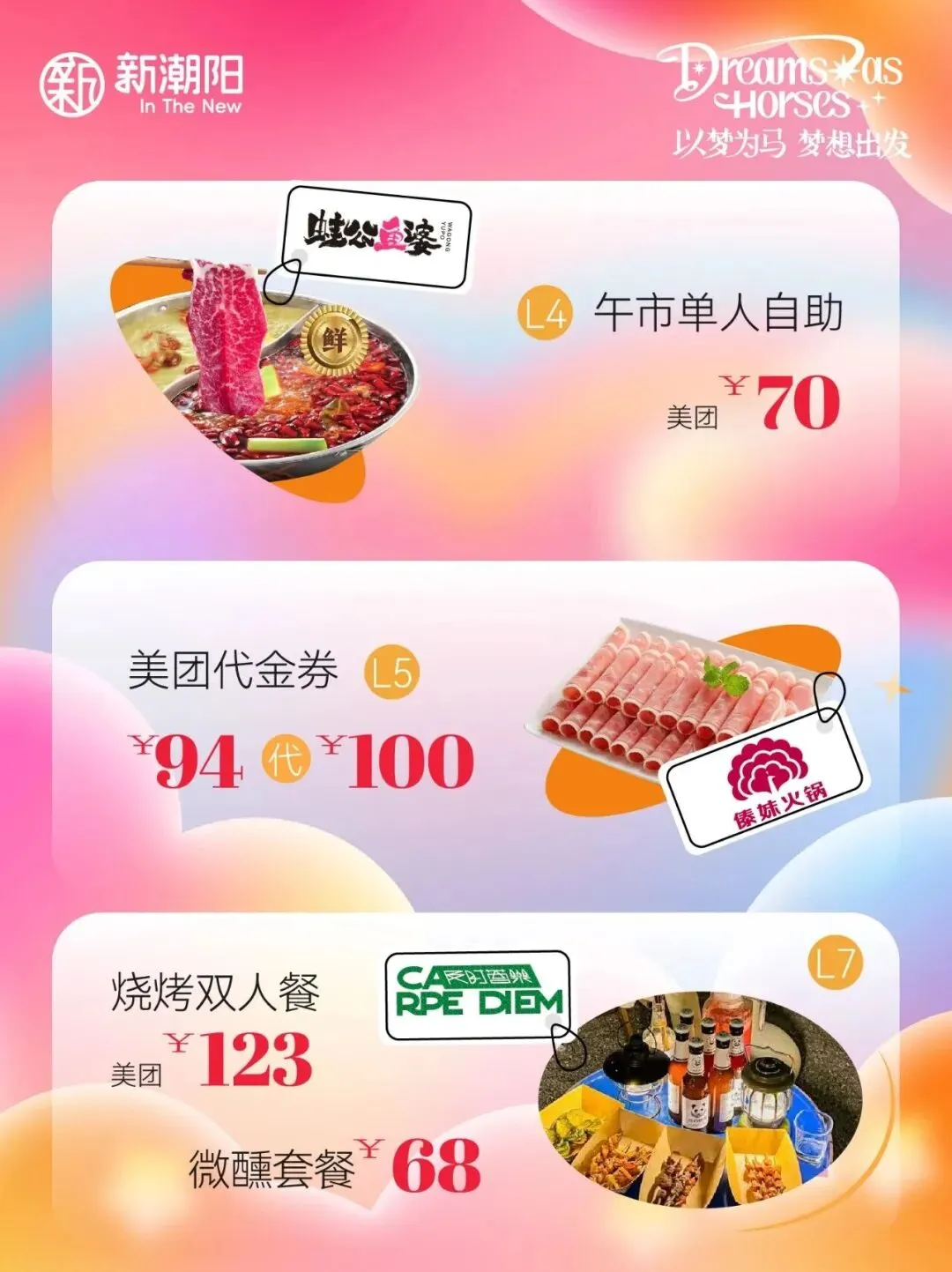 【𝗣𝗔𝗥𝗧𝟭】以梦为马 梦想出发,马年美陈预告【一爪入魂】5元11币 /20元48币 /39元99币 /69元180币/100元268币【穿越时空狙击战】单人票¥6.6/双人票¥11.9【四方朋友KTV】欢唱2小时¥39.9/欢唱3小时¥89.9【KFC】肯德基×鸣潮启程桶【破破烂烂的烤肉店】单人小火锅上市¥69【小龙坎火锅】鲜切牛肉¥11.9/¥40代¥50美团代金券【新八桂】柠檬鸭2-3人餐¥131【鑫盛江山自助餐】晚市单人自助¥69【鑫泉椰子鸡】2-3人餐¥88【蛙公鱼婆鲜切牛肉自助餐】午市单人自助¥70【傣妹火锅】¥94代¥100美团代金券【及时营乐】烧烤双人餐¥123/微醺套餐¥68
