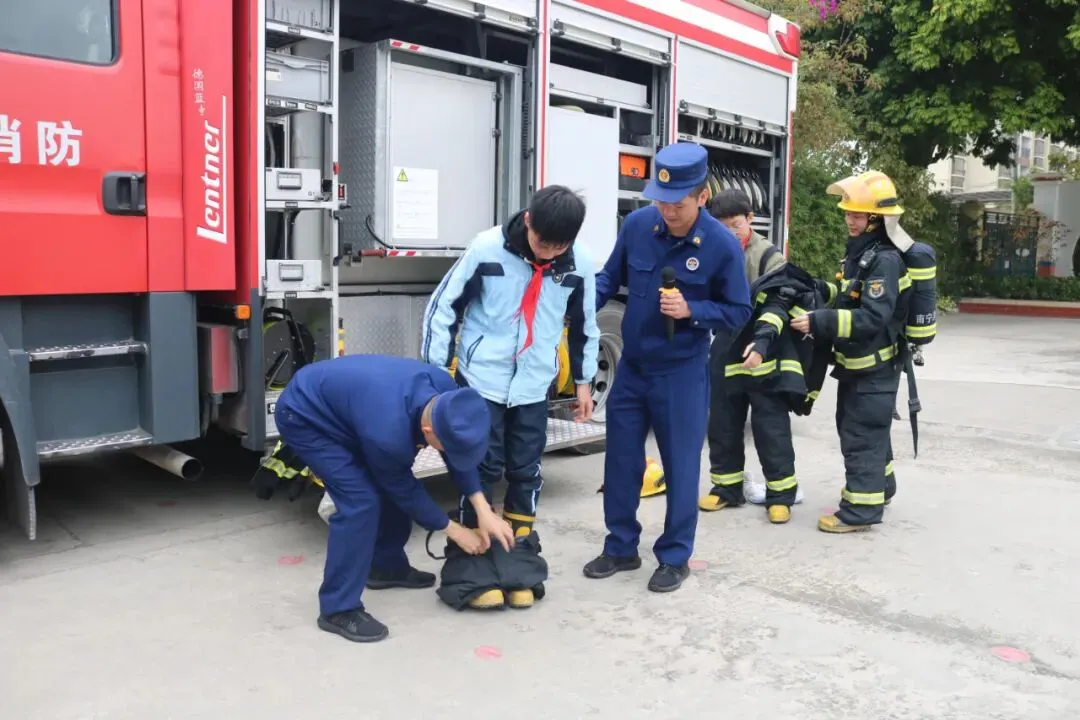 最吸引同学们的是体验环节。在消防员的指导下,同学们试穿了厚重的消防战斗服,戴上安全头盔,亲身体验消防员的不易与伟大。此外,消防员还展示了消防器材的使用方法,并让同学们在指导下模拟火灾喷水救援,现场不时传来阵阵惊叹和欢呼声。