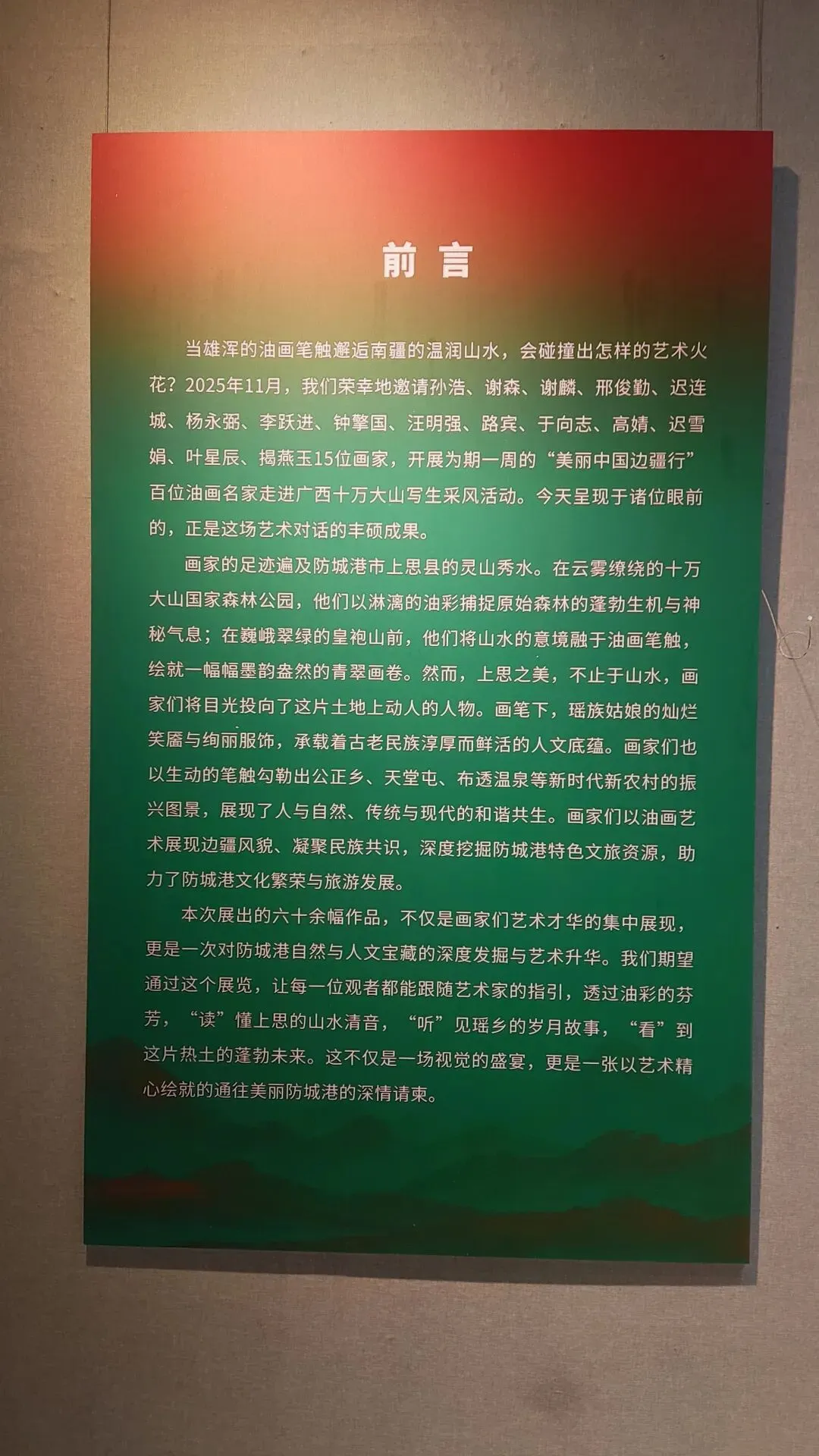 目前,艺术中心一楼展厅正在举办“美丽中国边疆行——百位油画名家走进广西十万大山写生采风创作展”。来自全国各地的画家,用充满张力的笔触,将十万大山的原始森林、瑶族村寨的烟火气与乡村振兴的新貌定格在画布上,色彩浓烈而情感真挚,带你沉浸式领略南疆的自然与人文之美。