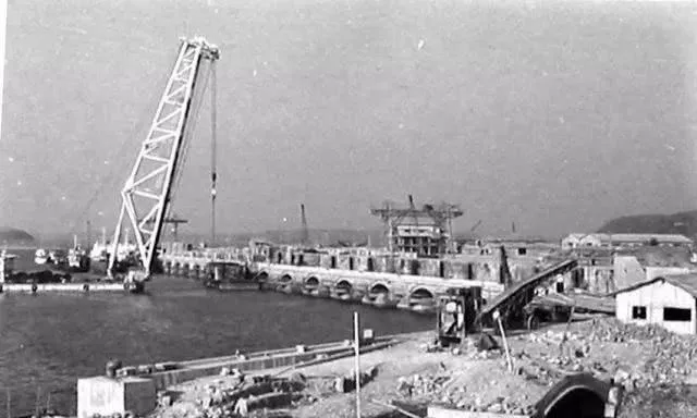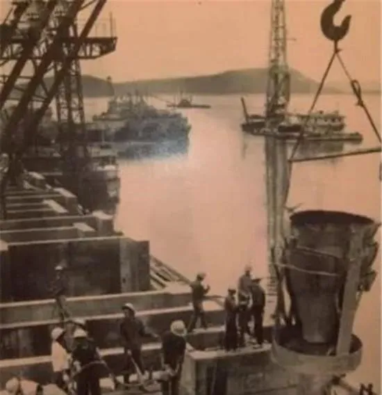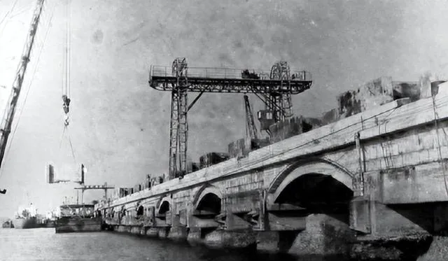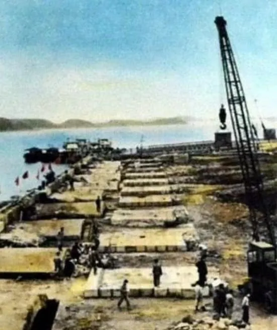 图里那排拱洞是沉井基础,吊臂把方块吊起来,落在预留的槽里,像搭木积木一样,一块对一块,潮水一涨一落,人就趁缝干活,妈妈说,这样的节奏最磨人,可也最出活.