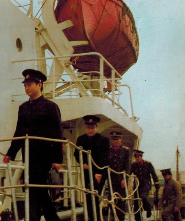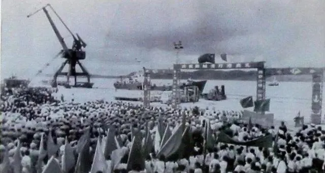 这个场景叫开港典礼,锣鼓喧天,人挤人,红旗一排排,广州来的远洋船靠了岸,联检人员排着队登轮,黑呢制服笔挺,小时候就爱看他们帽檐上的徽章,闪得亮堂堂的.