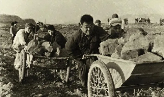 这阵势你一看就懂,独轮车前宽后窄,手把子包着布条,推的人憋住气往前杠,石头在车斗里咣当咣当,没有精密设备的时候,就靠肩膀和手心的茧.