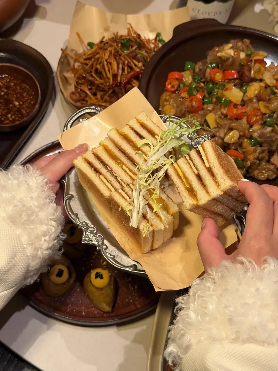 最先上桌的是春庄招牌吐司,刚端上来就被颜值惊艳——吐司外皮烤得像琥珀色的金砖,边缘微微焦脆,表面刷了一层蜂蜜,泛着诱人的光泽,还没凑近就闻到浓郁的奶香味。用筷子轻轻一夹,“咔嚓”一声脆响,外皮酥到掉渣,内里却裹着满满的香甜内馅,像是融化的芝士混着细腻的芋泥,还藏着几颗脆啵啵,口感层次直接拉满。原本不爱吃吐司的朋友,尝了一口就停不下来,硬生生炫了半份,边吃边说:“这吐司也太绝了!甜而不腻,酥脆又绵软,新年吃这个,日子肯定甜滋滋!”
