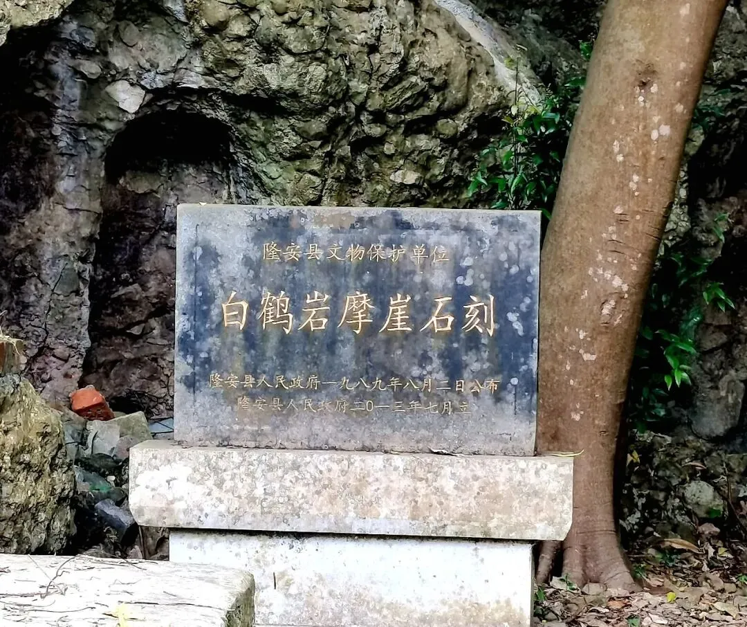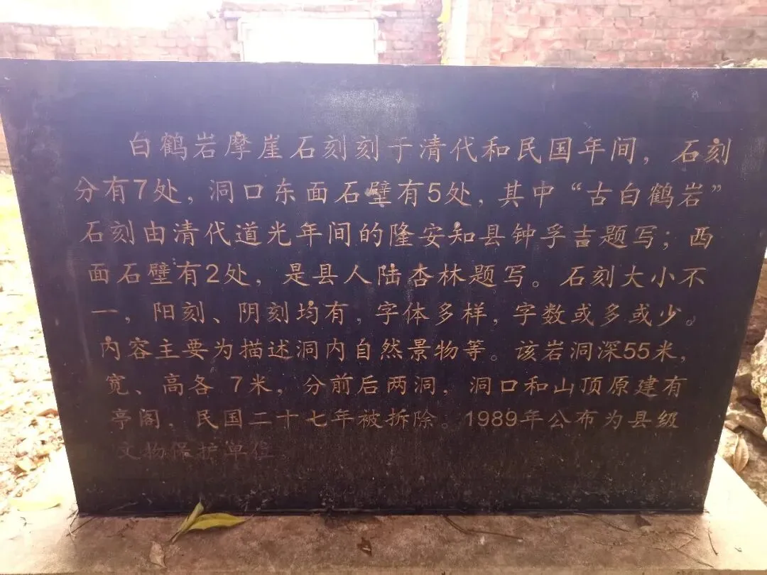 白鹤岩位于隆安县城北面3公里处,岩洞深55米,宽、高各 7米,分前后两洞。摩崖石刻刻于清代和民国年间,石刻分有7处。石刻大小不一,阳刻、阴刻均有,字体多样,字数或多或少。内容主要为描述洞内自然景物等。现存摩崖石刻第一幅“古白鹤岩”四个大字,字高26厘米、宽26厘米,横排。落款“闽武钟孚吉书”。钟孚吉是福建武平人,嘉庆二十五年任隆安知县。第二幅宽88厘米、高65厘米。是竖排的五言律诗一首:“斯岩别有天,幽雅却无边。石立形如鹤,溪流声似弦。清风生嫣嫣,爽气挹绵绵。好景真堪赏,盘桓不忍旋。”署名处部分文字损毁严重,可辨认的有“容县覃扶之题道光廿六年秋”等字。第三幅石刻宽165厘米、高42厘米。“阆苑福地” 四个大字横排,字高33厘米、宽29厘米。前款“大清光绪廿六年仲秋”,后款“昭潭仇铣敬刊”。全部文字均为阳刻。第四幅石刻宽51厘米、高63厘米,竖排,是一首无题诗:“龙隐虽云最著名,谁知鹤立夐其形,廉藏古洞非关俸,守比孤松倍耐情,安得九皋鸣盛世,永随三宝镇隆城,重新楼阁称觥祝,寿美同呼万岁声”。落款“岑溪黄文衡题”。黄文衡是广西岑溪人,1932年任隆安县长。第五幅宽36厘米、高42厘米。前款小字“民国廿二年秋”,八个大字“天原非小,山不在高”,竖排。署名“邑人黄朝桐”。黄朝桐是本县古潭乡中真村头屯人,清宣统元年(1909)拔贡,是民国二十三年《隆安县志》的主要编纂人之一。最后两幅石刻在洞口的右侧高处,竖排,各高155厘米、宽55厘米。其文“鹤岩胜景,蝶县奇观”。两幅石刻的右侧另刻一行较小文字“民国癸酉春重建”。落款为“岑溪黄文衡题”,民国癸酉年即1933年。因山洞岩石属红砂砾岩,容易风化破碎,加上多年没有采取保护措施,部分石刻有所损坏。钟孚吉重修时立于岩内左侧的《修白鹤岩记》石碑,是研究白鹤岩的核心史料,却于1986年前后被毁,仅留基座凹槽;岩洞通天洞旁传说为李铁拐所留的“仙人脚印”凹痕,在某企业洞内建设中被填平;岩洞内还曾建起3处建筑物,直接破坏了石刻与岩洞相融的历史风貌。名字源由:三说传世藏雅韵