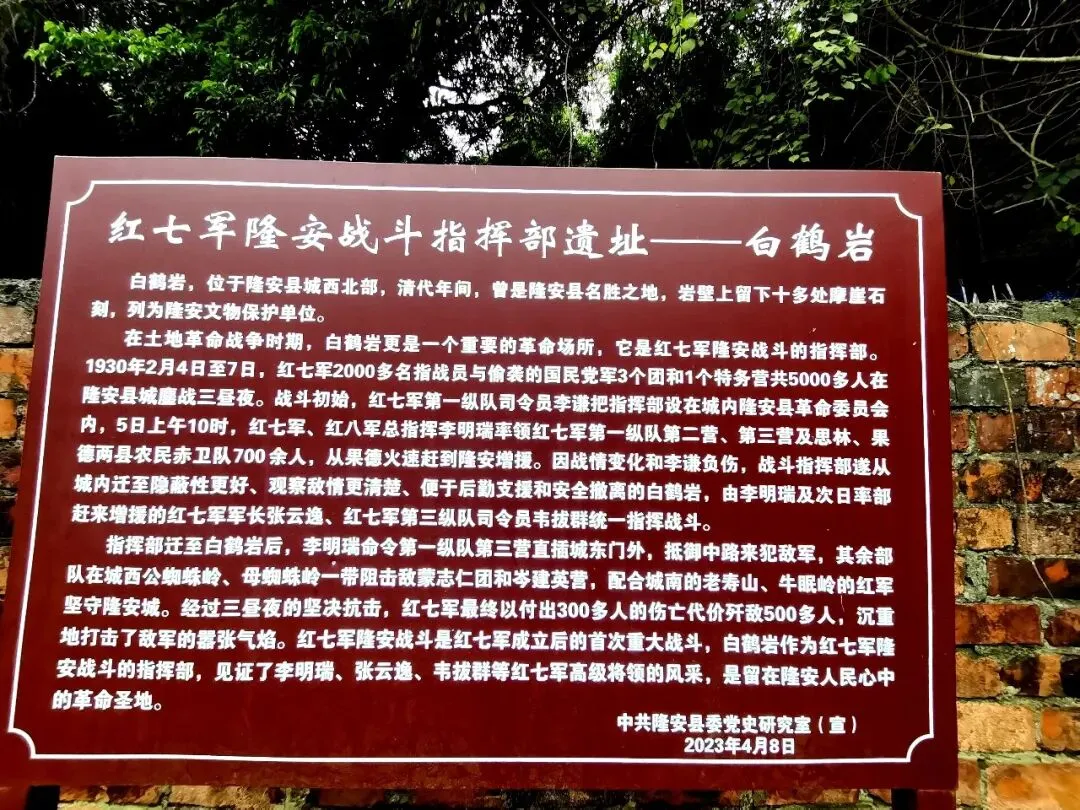 白鹤岩不仅是积淀古韵的名胜之地,更是土地革命战争时期极具纪念意义的红色革命遗址,作为红七军隆安战斗的临时指挥部,它见证了红七军成立后的首次重大浴血奋战,是隆安人民心中不朽的革命圣地。1930年2月4日至7日,红七军2000多名指战员与偷袭的国民党军3个团和1特务营共5000多人在隆安县城鏖战三昼夜。战斗初始,红七军第一纵队司令员李谦把指挥部设在城内隆安县革命委员会内,5日上午10时,红七军、红八军总指挥李明瑞率领红七军第一纵队第二营、第三营及思林、果德两县农民赤卫队700余人,从果德火速赶到隆安增援。因战情变化和李谦负伤,战斗指挥部遂从城内迁至隐蔽性更好、观察敌情更清楚、便于后勤支援和安全撤离的白鹤岩,由李明瑞及次日率部赶来增援的红七军军长张云逸、红七军第三纵队司令员韦拔群统一指挥战斗。指挥部迁至白鹤岩后,李明瑞命令第一纵队第三营直插城东门外,抵御中路来犯敌军,其余部队在城西公蜘蛛岭、母蜘蛛岭一带阻击敌蒙志仁团和岑建英营,配合城南的老寿山、牛眠岭的红军坚守隆安城。这场战斗敌我力量悬殊,红军在弹药补给被截、地势不利的情况下顽强抗敌,最终以300余人的伤亡代价歼敌500多人,沉重打击了国民党反动派的嚣张气焰,彰显了红七军将士不怕牺牲的革命精神。白鹤岩作为战斗核心指挥地,见证了李明瑞、张云逸、韦拔群等先辈的军事智慧与战斗风采;1982年,红七军老战士黄明政还曾重返白鹤岩,与隆安各界人士留影,为这段红色历史留下珍贵史料。可就是这样一处红色圣地,却在保护与传承上存在明显短板:无完善的红色历史讲解系统、无战斗场景复原与展示、无核心点位标识,让这处红色遗址少了该有的庄严肃穆。不少游客来此缅怀革命先辈,却因缺乏相关介绍,难以感受当年的战斗豪情,无法深刻理解白鹤岩在右江革命根据地斗争中的重要意义。白鹤岩,一面是清民石刻的笔墨留香,一面是红七军的铁血荣光,一面是自然天成的山水之美,本应是隆安乃至南宁的文旅与红色名片,如今这处宝地却难以发挥其应有的价值。希望有识之士让石刻古韵被妥善守护,让文化传说被广泛传扬,让红色故事被生动讲述,让隆安白鹤岩,不再是让人“大跌眼镜”的遗憾,而是名副其实的文化与红色宝藏!📍白鹤岩· 打卡指南