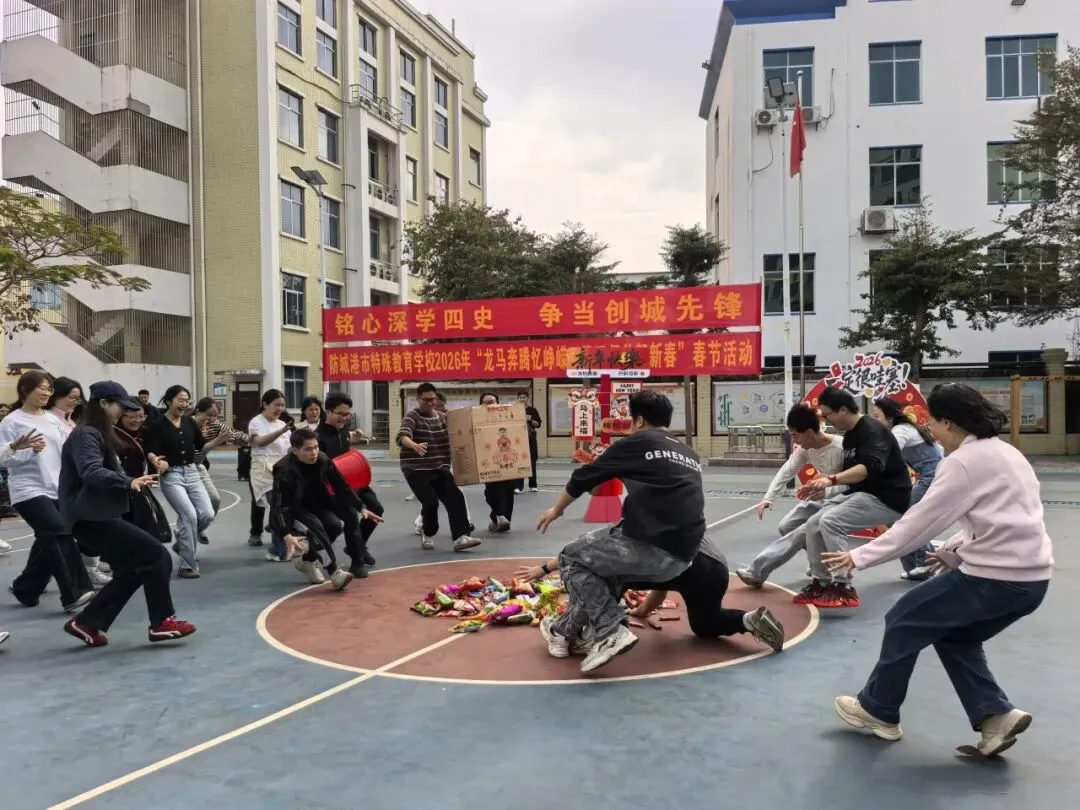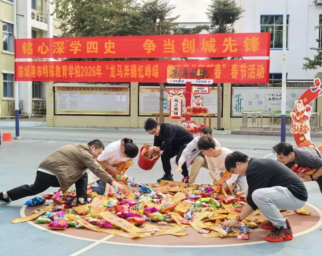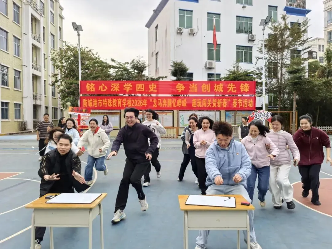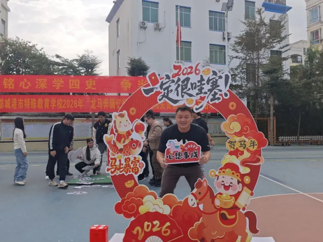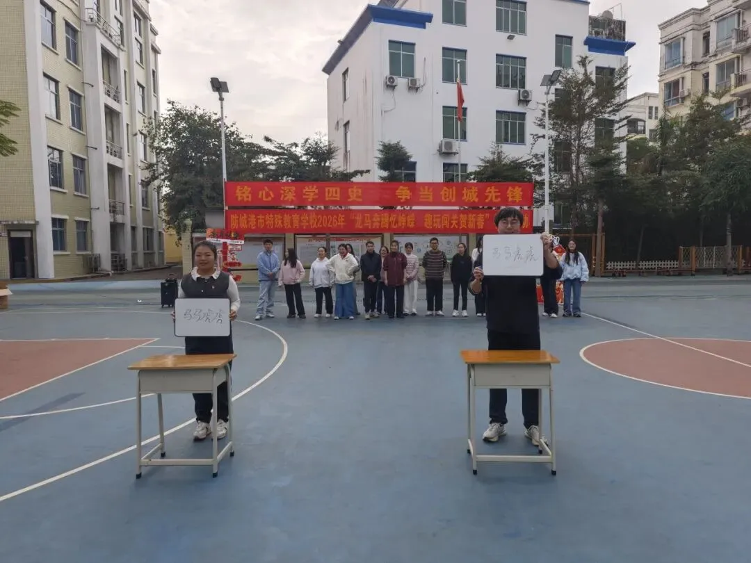 金龙辞旧岁,骏马迎新春。为营造欢乐祥和的节日气氛,丰富教职工文化生活,增强团队凝聚力与归属感,促进情感沟通,展现特教教师的风采与活力,1月30日上午,防城港市特殊教育学校以“龙马奔腾忆峥嵘,趣玩闯关贺新春”为主题的2026年春节活动在操场热闹开启,全体教职工齐聚一堂,共赴这场充满趣味与温情的新春之约。