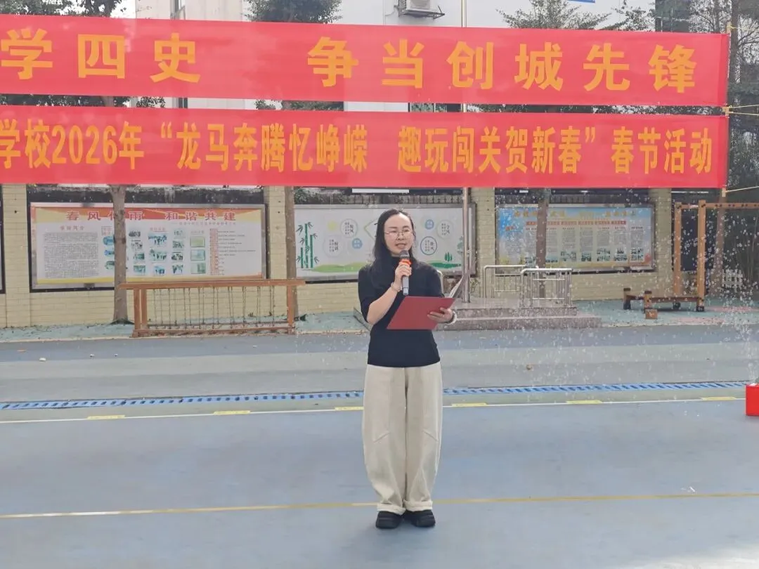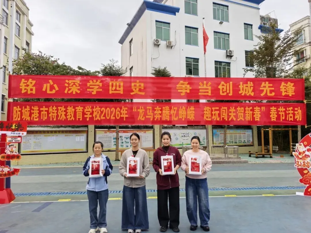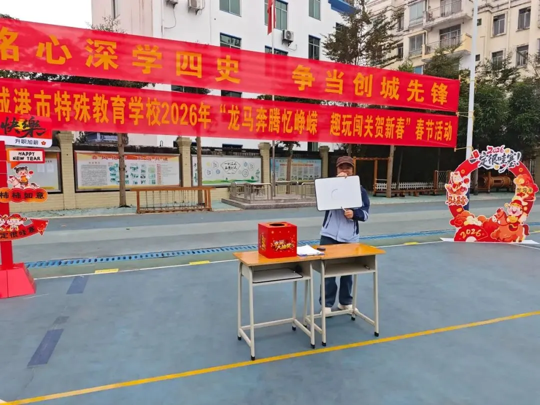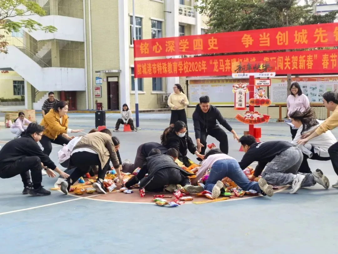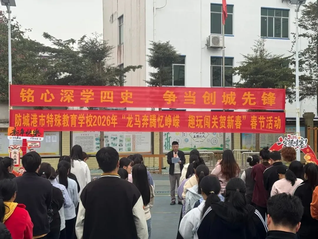 金龙辞旧岁,骏马迎新春。为营造欢乐祥和的节日气氛,丰富教职工文化生活,增强团队凝聚力与归属感,促进情感沟通,展现特教教师的风采与活力,1月30日上午,防城港市特殊教育学校以“龙马奔腾忆峥嵘,趣玩闯关贺新春”为主题的2026年春节活动在操场热闹开启,全体教职工齐聚一堂,共赴这场充满趣味与温情的新春之约。