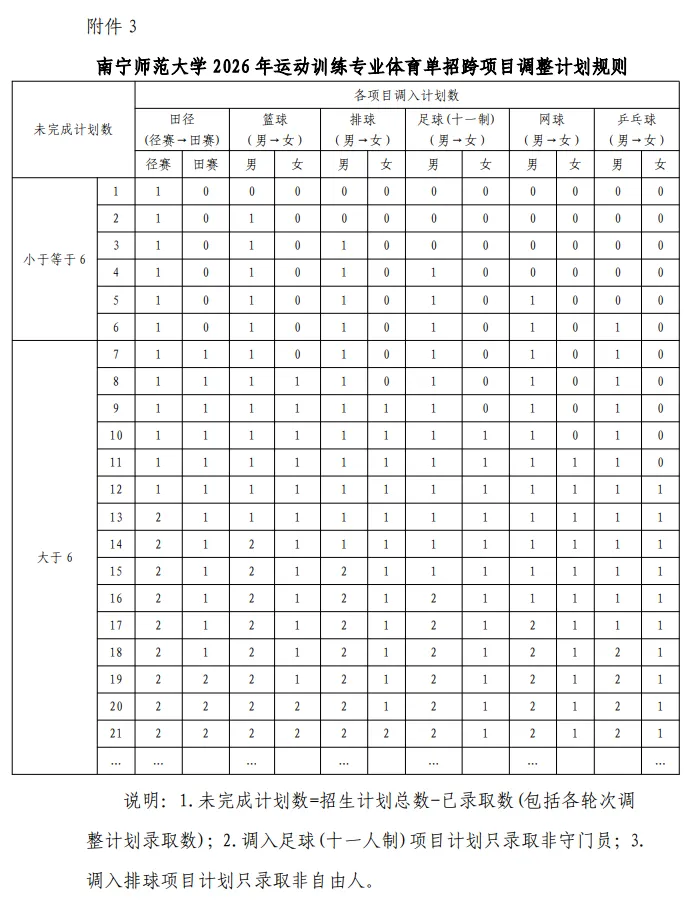 4.项目内调整计划及录取规则。第二志愿录取后未完成的招生计划,按以下规则调整计划及录取。(1)分性别安排招生计划的项目,项目内有符合条件生源时,在不同性别间调整计划,按综合分从高到低排序录取(足球、排球除外)。(2)足球(十一人制)项目内有符合条件生源时,在同性别间调整计划,仅限守门员未完成的计划调入非守门员,按综合分从高到低排序录取。(3)排球项目内有符合条件生源时,在同性别间调整计划,仅限自由人未完成的计划调入非自由人,按综合分从高到低排序录取。(4)田径项目内有符合条件生源时,在田赛项目和径赛项目间调整计划,即田赛项目未完成的计划调入径赛项目,或径赛项目未完成的计划调入田赛项目,按综合分从高到低排序录取。项目内调整计划规则详见附件2《南宁师范大学2026年运动训练专业体育单招项目内调整计划规则》。
