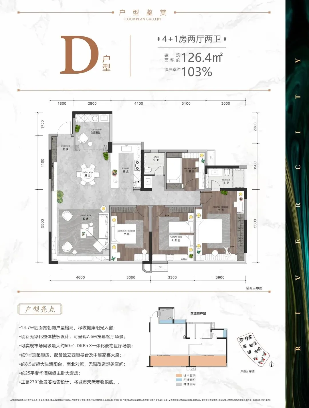户型综合使用率约103%,面宽长约14.7米,主要起居及休闲区域皆朝南,客厅原结构约7.6米长。超大生活阳台约8.5㎡,厨房约9㎡,改造自由度高。