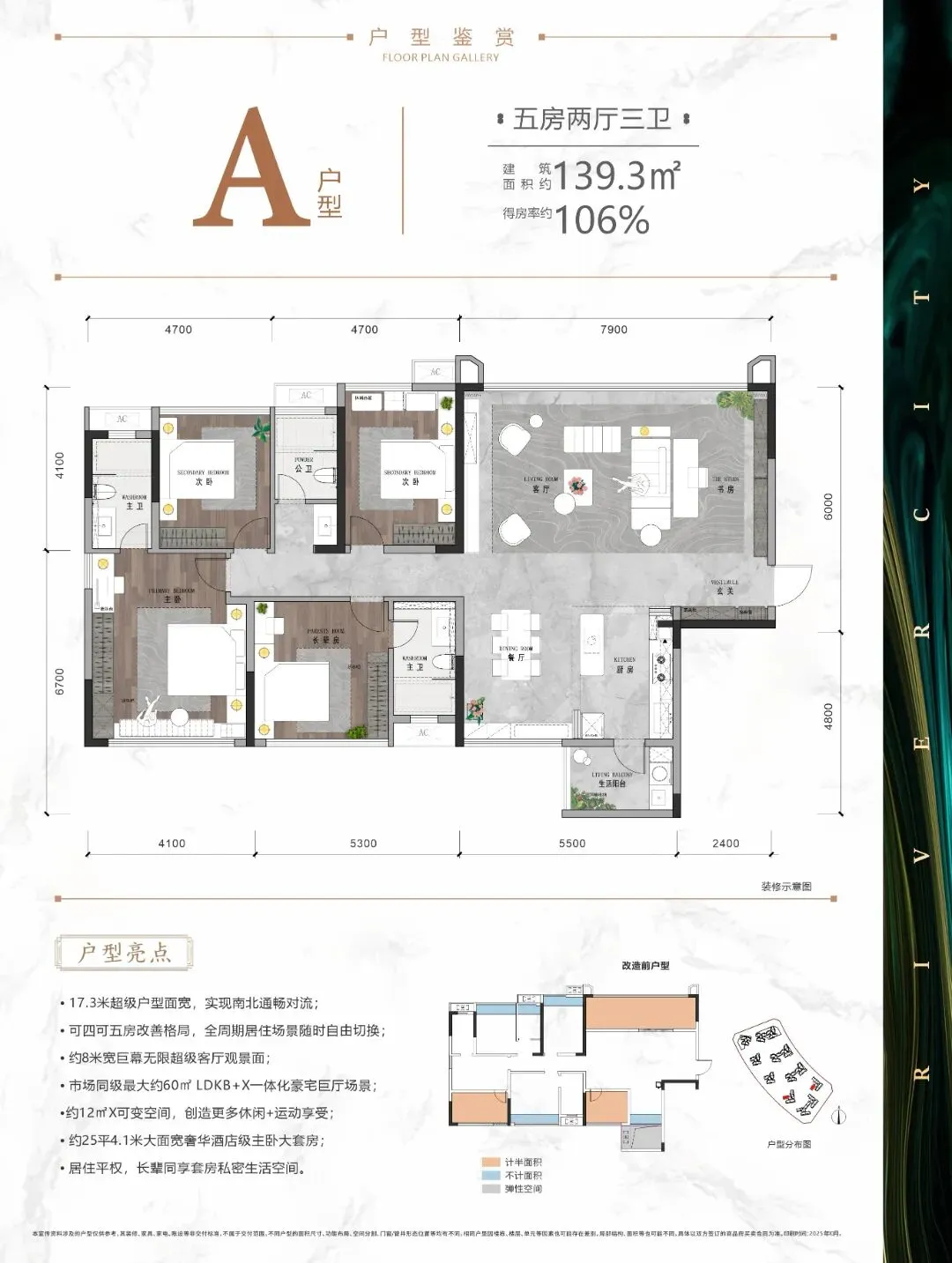 其他户型也很强势,比如建面约140㎡5房户型与约126㎡4+1房户型都有着市场同级最大的约60㎡LDKB+X一体化巨厅,主卧都达到约25㎡;建面约112㎡户型与约108㎡户型宽幕客厅原结构均为6.9米左右,公区均为LDKB一体化,主卧面积均为约22.5㎡、面宽约5.4米,并有270°全景落地窗设计。