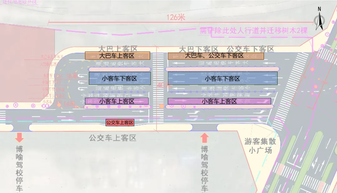 集散中心设置相应的上下客通道,通道仅允许车辆临时停车上下客,禁止车辆在此长时间停放或停车候客。