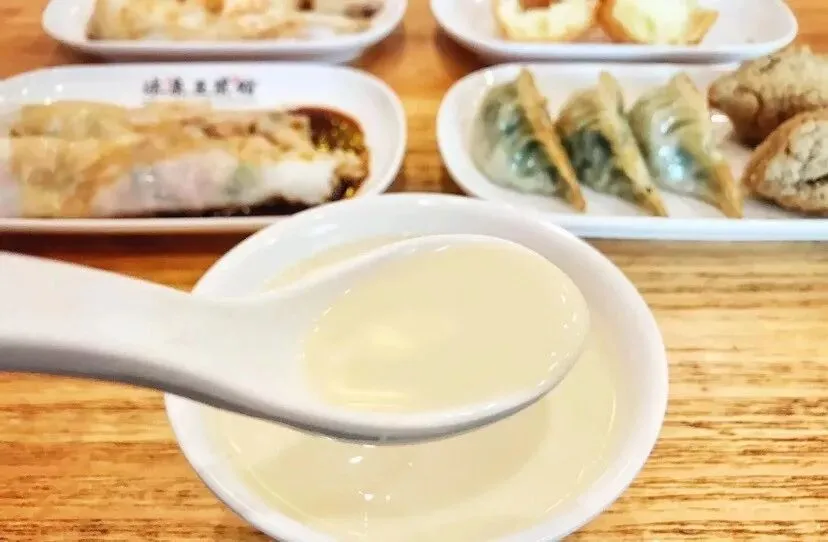 冰泉豆浆馆的滴珠豆浆,是因其纯浓程度之高,用汤勺舀而滴下,滴落在桌面上,聚而不散。