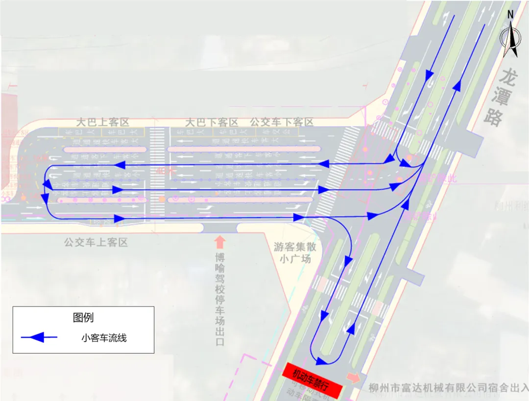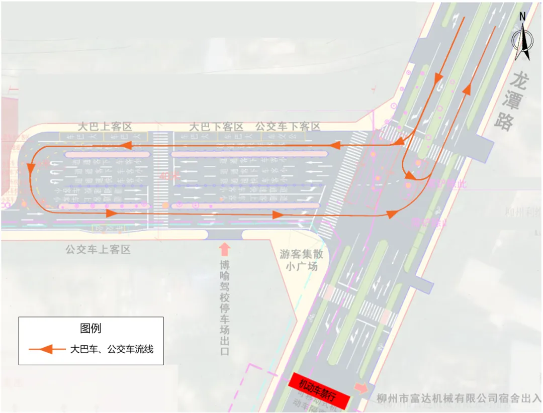 一、自2026年2月1日起,龙潭路(柳州市富达机械有限公司宿舍至龙潭公园大门路段)禁止所有机动车通行,机动车通过龙潭路集散中心道路通行。