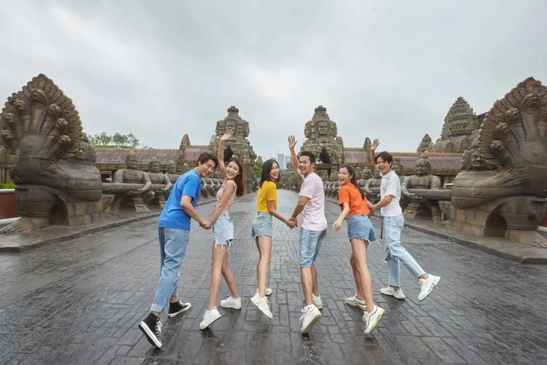 离开亲子游玩区,我们来到了柬埔寨主题区,迎面的宏伟建筑是东方四大奇迹之一的吴哥窟,快拿起你的手机来一张合照吧!【走进吴哥】是目前世界上最大的弧形巨幕影院,神奇美妙的观影效果,震撼再现柬埔寨悠久灿烂的历史文化和吴哥建筑的奇迹。走进吴哥的左边是魔方幻影剧场【万塔之城】,通过虚景和真人舞台表演完美的演绎,让您置身在唯美梦幻的蒲甘,追忆缅甸千年古老王朝的繁华盛景