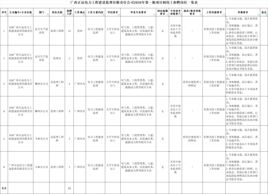 本次招聘24人,其中总监理工程师4人、监理工程师18人、监理员2人。具体岗位职数、岗位职责、任职要求等详见《广西正远电力工程建设监理有限责任公司2026年第一批项目制用工招聘岗位一览表》。