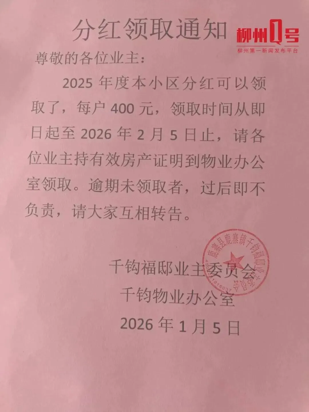 鹿寨县千钧福邸小区发布《分红领取通知》。