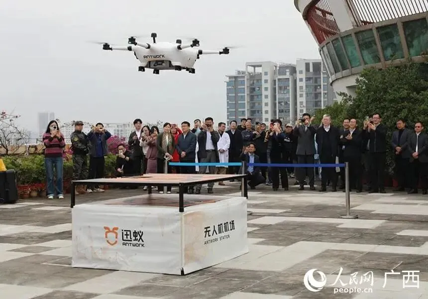 南宁市首条智能无人机医疗物资低空运输航线首飞现场。人民网记者 王勇摄