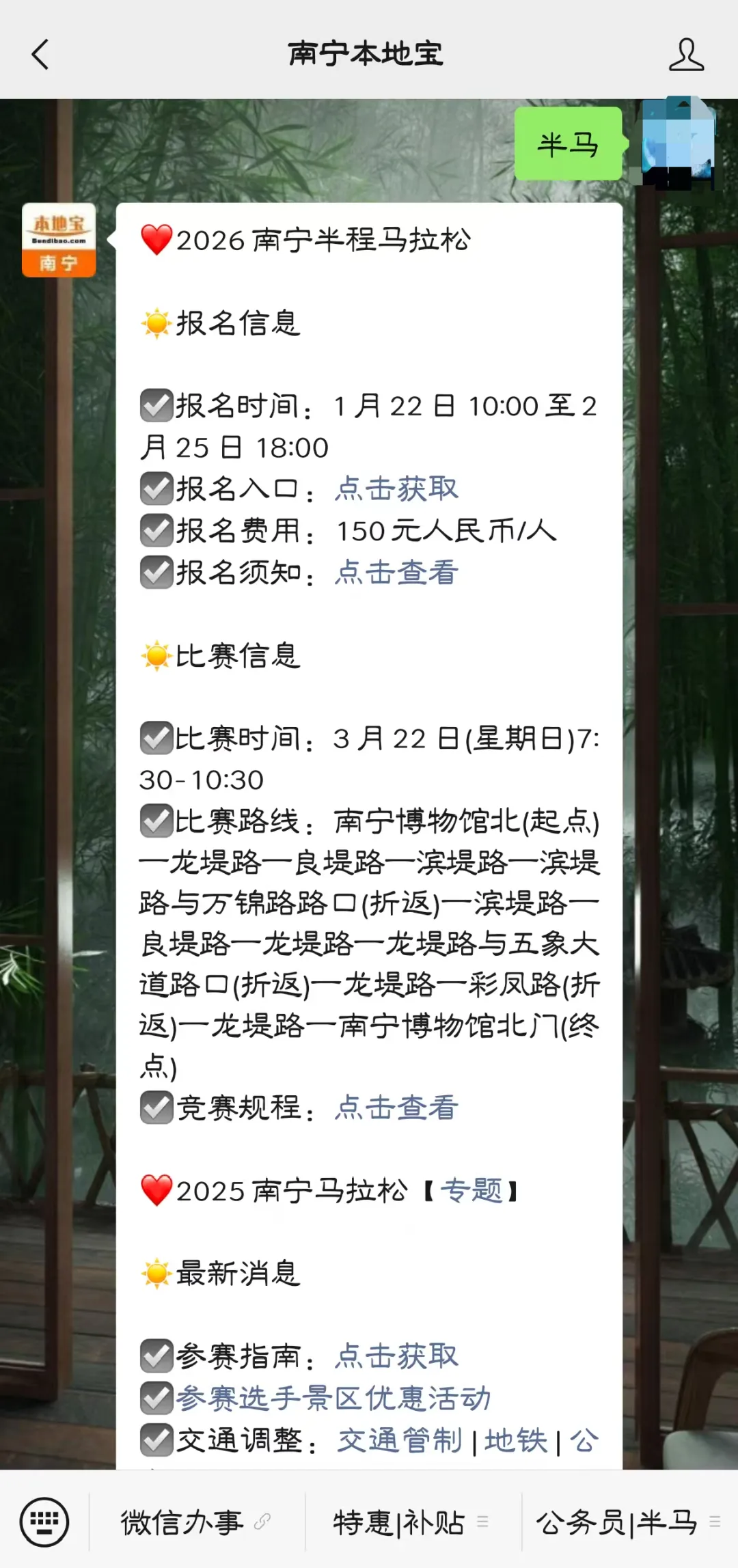 扫描/识别下方二维码,关注【南宁本地宝】公众号,在对话回复【半马】,获南宁半程马拉松报名入口、报名须知、竞赛规程等。