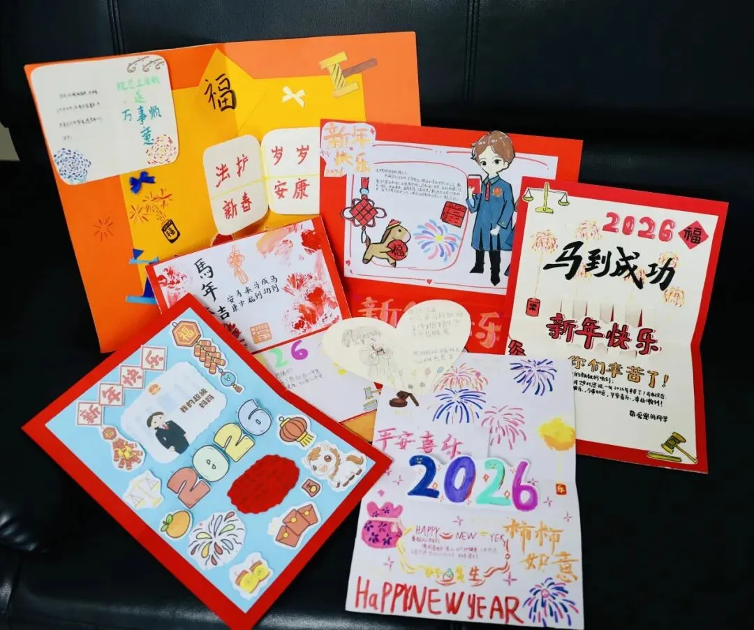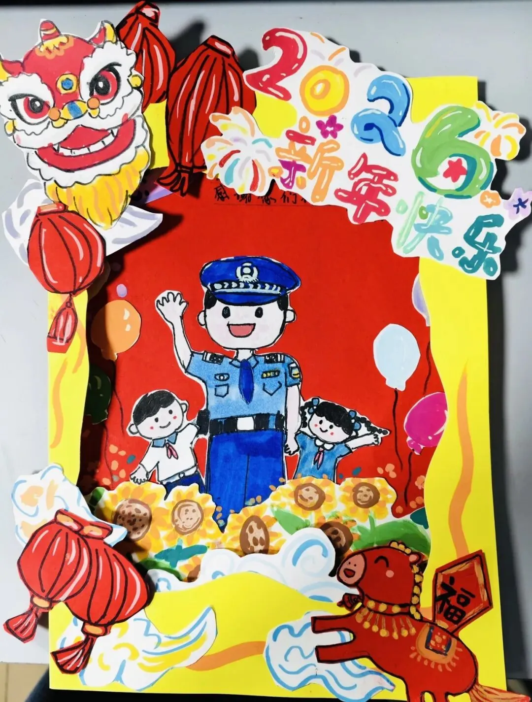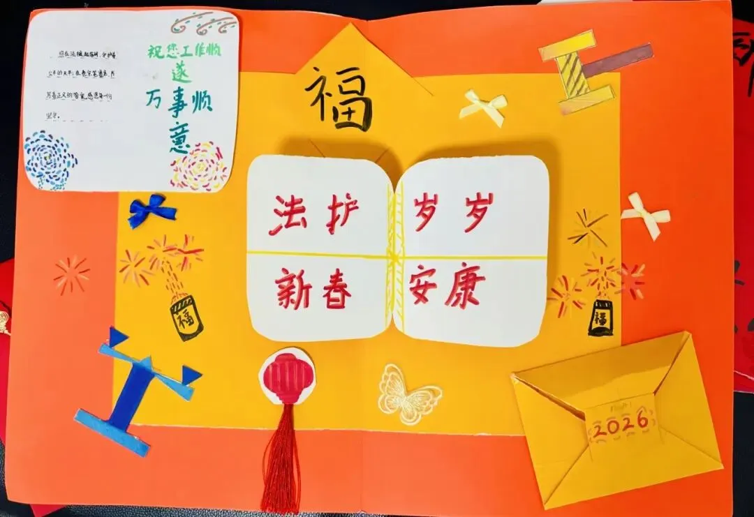 活动前期,各校区警察、消防、法院工作人员子女,手绘“我心中的爸妈”主题作品、拍摄暖心视频,诉说对父母的理解与敬爱。其他党、团、队员亲手书写“福”字、对联,制作新年贺卡,于一笔一划的用心创作中写下暖心祝福。