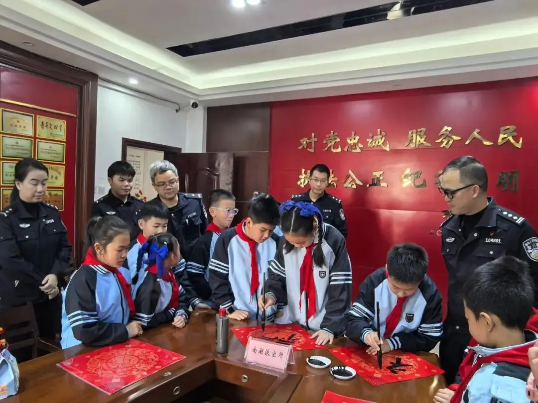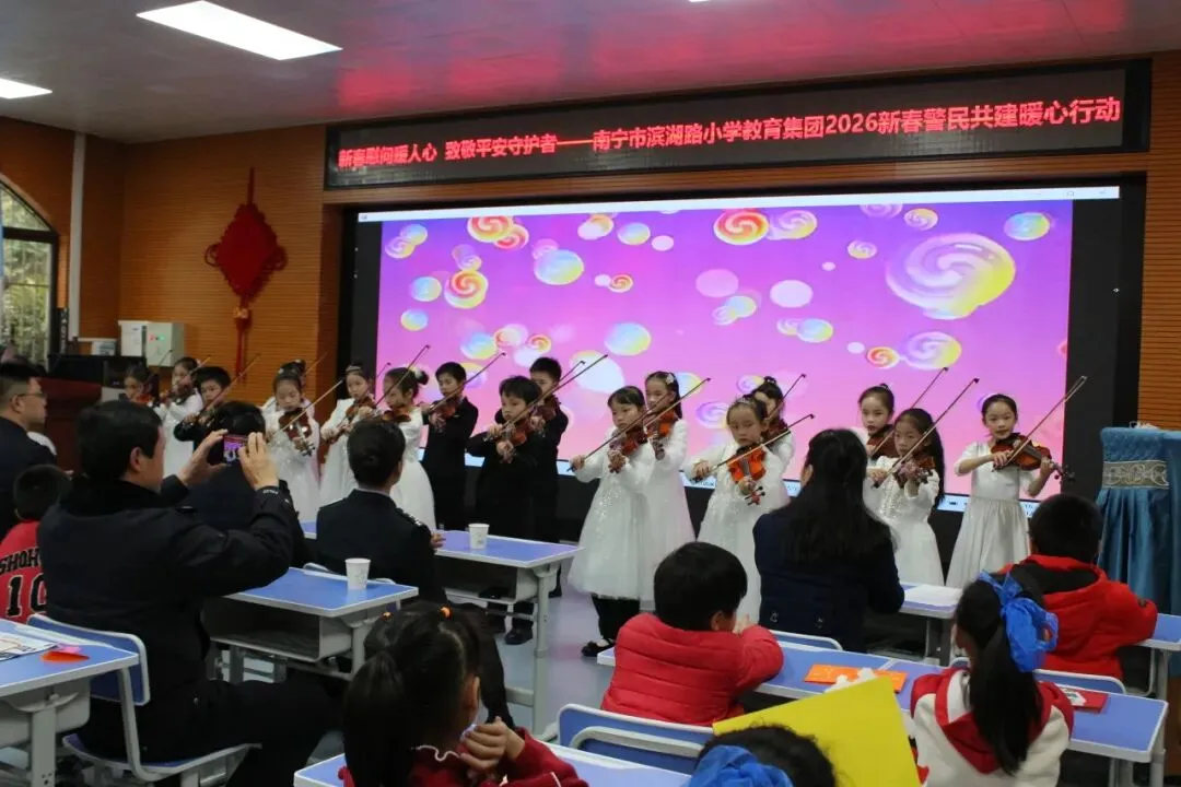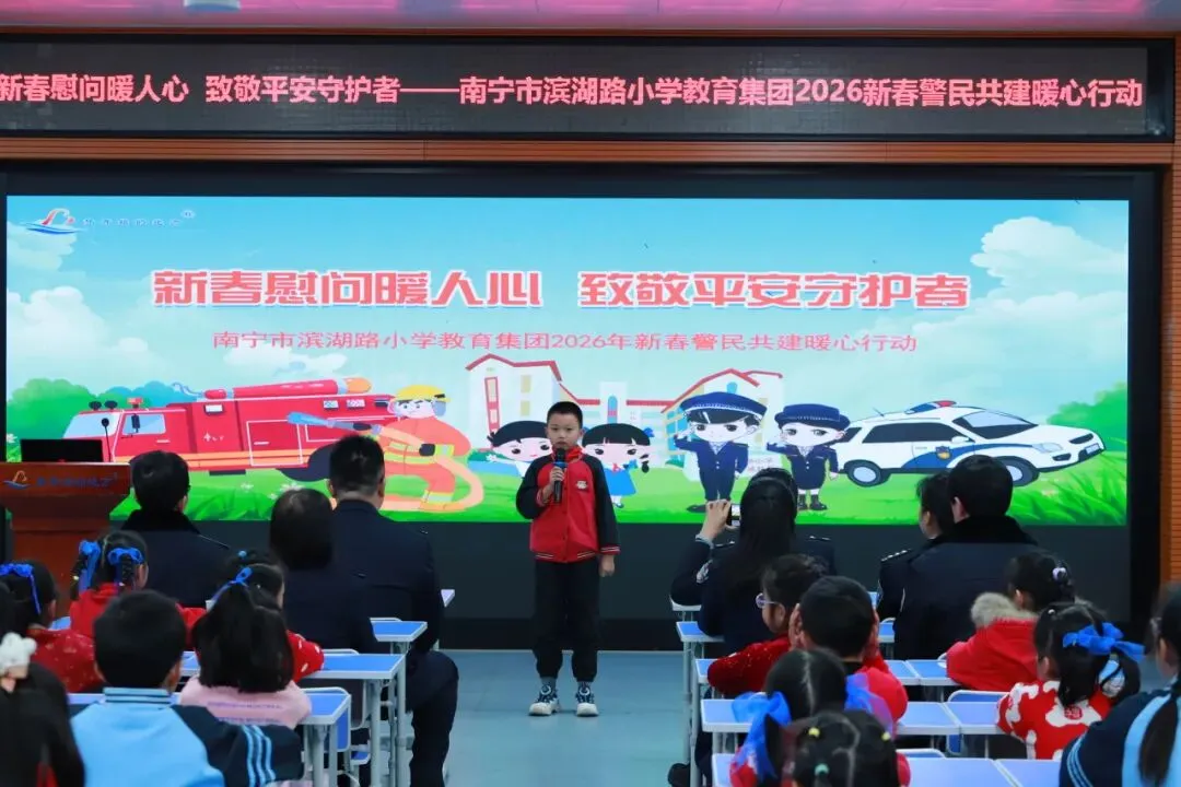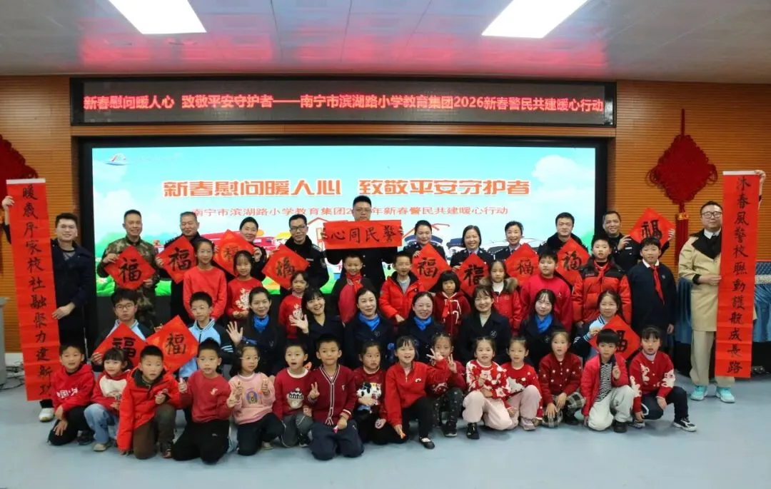 南宁市滨湖路小学教育集团以“双向奔赴,温暖共情” 为核心,组织党、团、队员代表走进辖区派出所、交警大队、消防救援大队、法院等单位,开展新春慰问活动。活动通过实践体验培育学生的共情理解、感恩之心与责任担当,向守护平安的一线工作人员送上新春祝福。