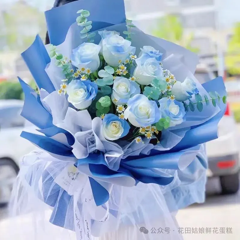 以蓝色妖姬为主要花材的花束,神秘而浪漫。蓝色妖姬的花瓣呈现出深邃的蓝色,宛如浩瀚的星空,11 枝蓝色妖姬搭配白色的满天星和银色的丝带,寓意着 “一心一意的爱” ,仿佛在诉说着牛郎织女般坚贞不渝的爱情。粉白相间的玫瑰组合花束也备受欢迎,粉色玫瑰的温柔与白色玫瑰的纯洁相互交融,搭配上淡紫色的勿忘我的花束,象征着 “浪漫与纯洁的爱” ,非常适合在七夕这个特殊的日子里,向心爱的人表达爱意。