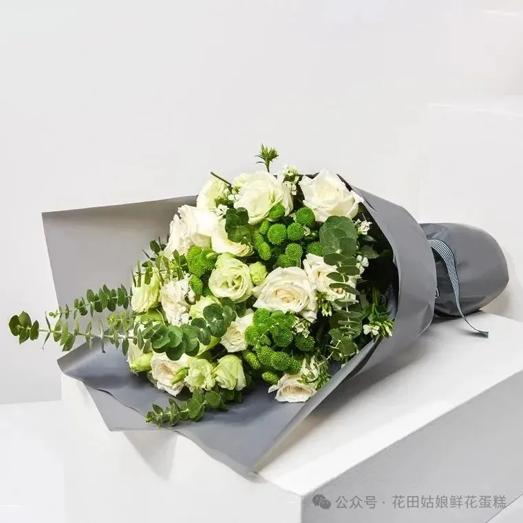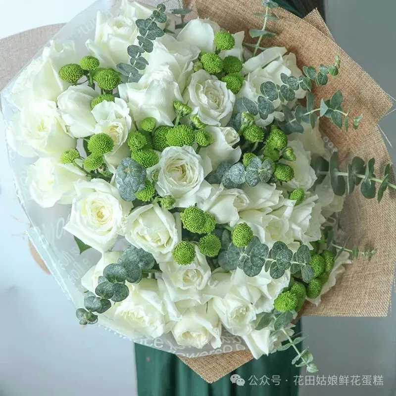 花 材:33朵精品白玫瑰,搭配绿色小雏菊、尤加利叶装饰。