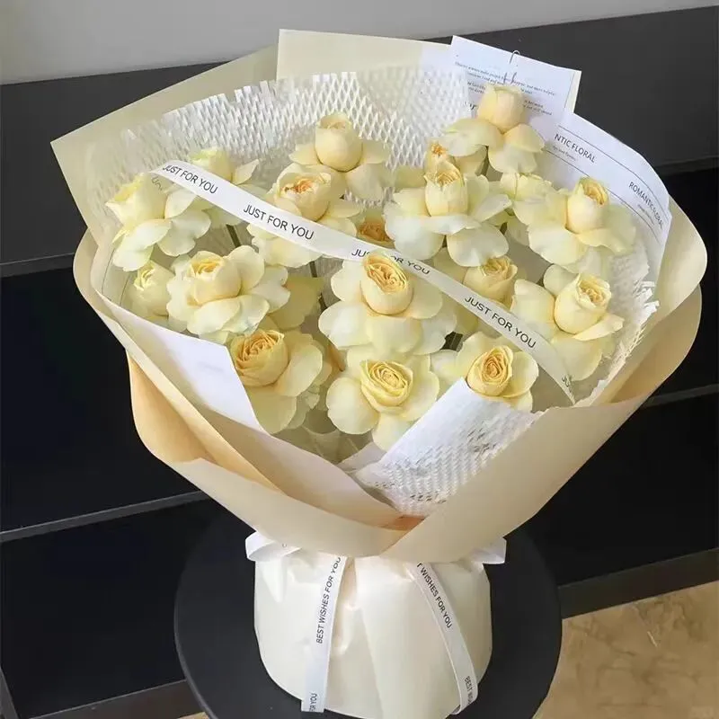 白色雪梨纸+绿色韩菲纸包装,白色英文缎带束扎。