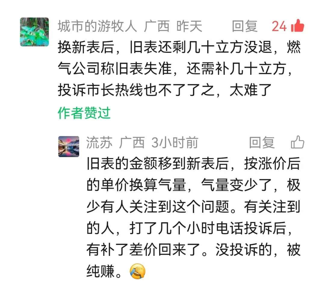 很多网友在后台留言或者发私信反馈:“提前给孩子上学、老人居家预存了几百方气,换表后少了几十方,血汗钱凭空蒸发”“换表前不告知计费模式变更,不签补充协议,直接强制转金额,这是明抢”“机械表安安稳稳,智能表越换越贵,便民工程变成宰客工具”。市民普遍认为,燃气公司利用换表机会,将气价上涨的成本,非法转嫁给已履行付款义务的消费者,属于典型的与民争利。