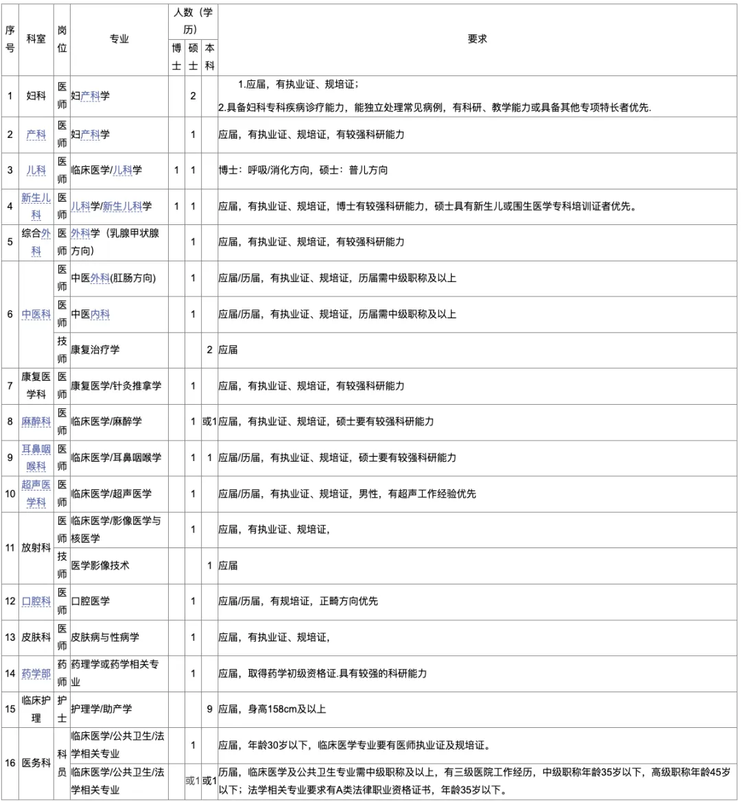 (4)其他情况,年龄要求:初级职称不超过30岁、中级职称不超过35岁、副高职称不超过45岁,正高职称不超过50岁;医师岗位要求四证齐全,即毕业证、学位证、医师资格证、规培证齐全。
