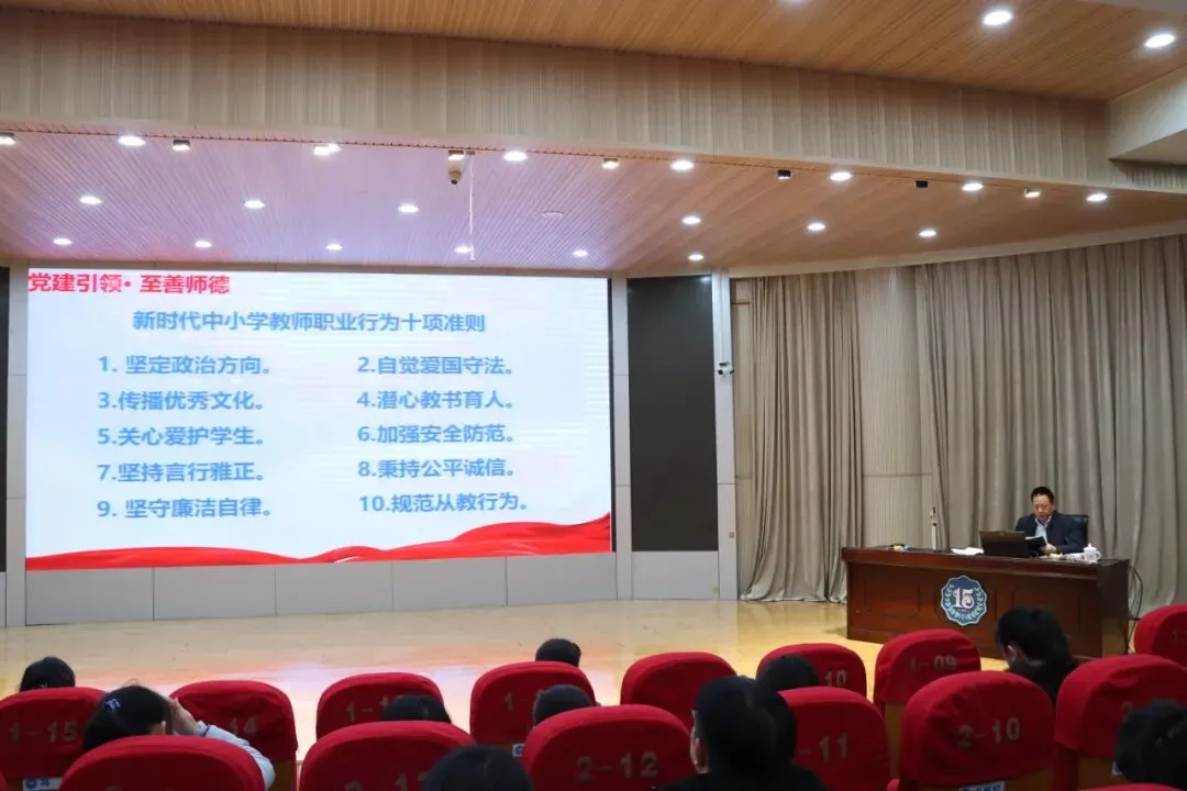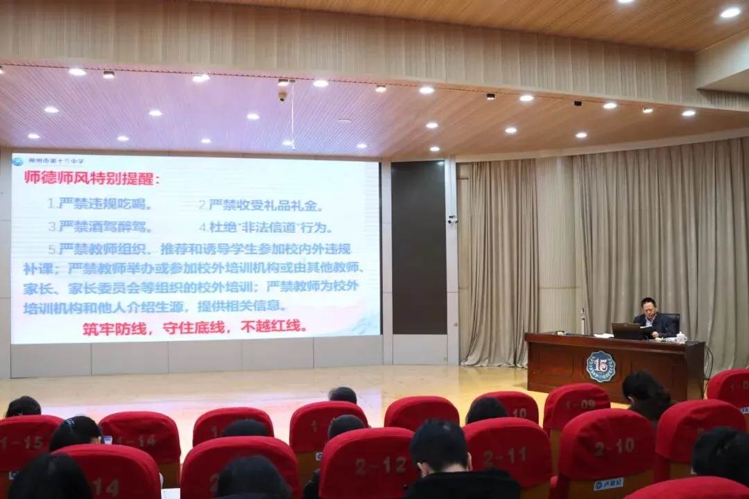 随后,学校党委书记胡立兵带领全体教职工系统、深入地学习了《新时代中小学教师职业行为十项准则》与《柳州市师德师风建设负面清单(试行)》,逐条解读其精神内涵与实践要求。胡立兵特别强调了师德师风建设的重要性,并结合具体案例,就严禁违规吃喝、收受礼品礼金、酒驾醉驾、违规补课及为校外培训机构提供生源等行为进行了重点提醒和警示教育。他要求全体教职工务必坚守教育初心,严守职业底线,自觉维护教师队伍的清正形象,做学生为学、为事、为人的示范。会议现场学习氛围浓厚,与会教师认真聆听并记录要点。