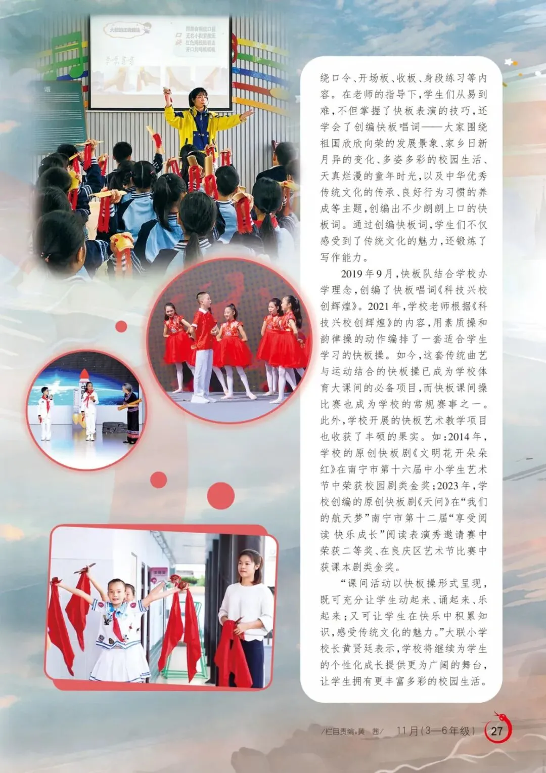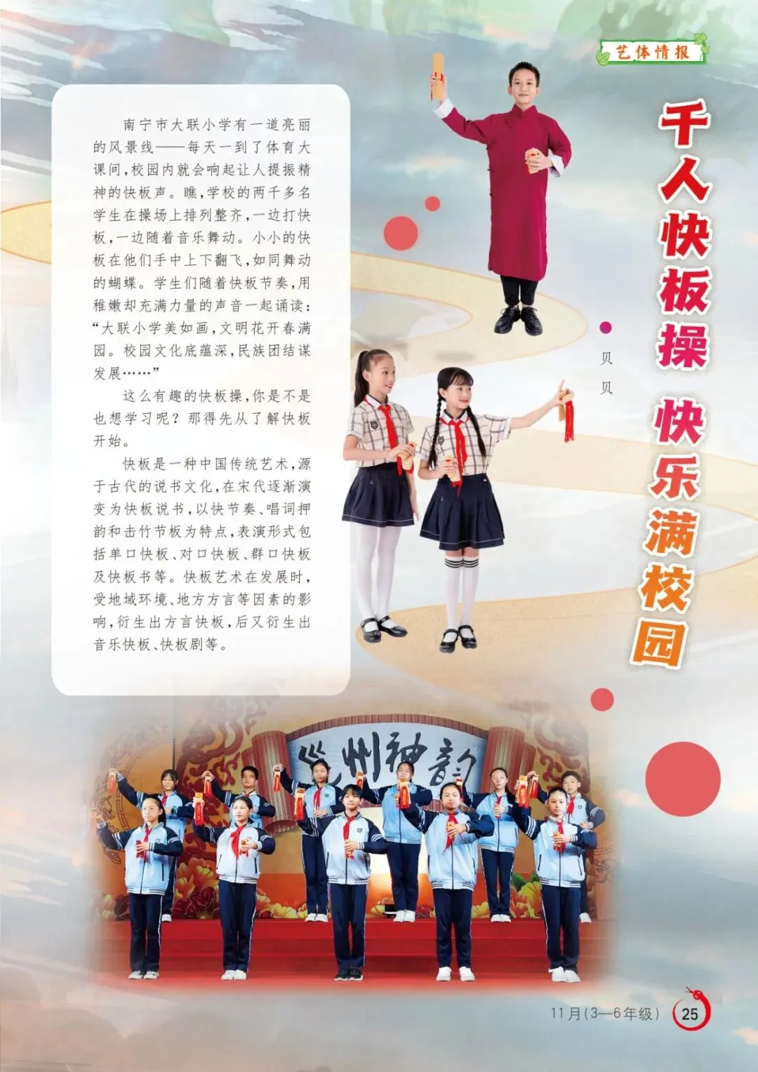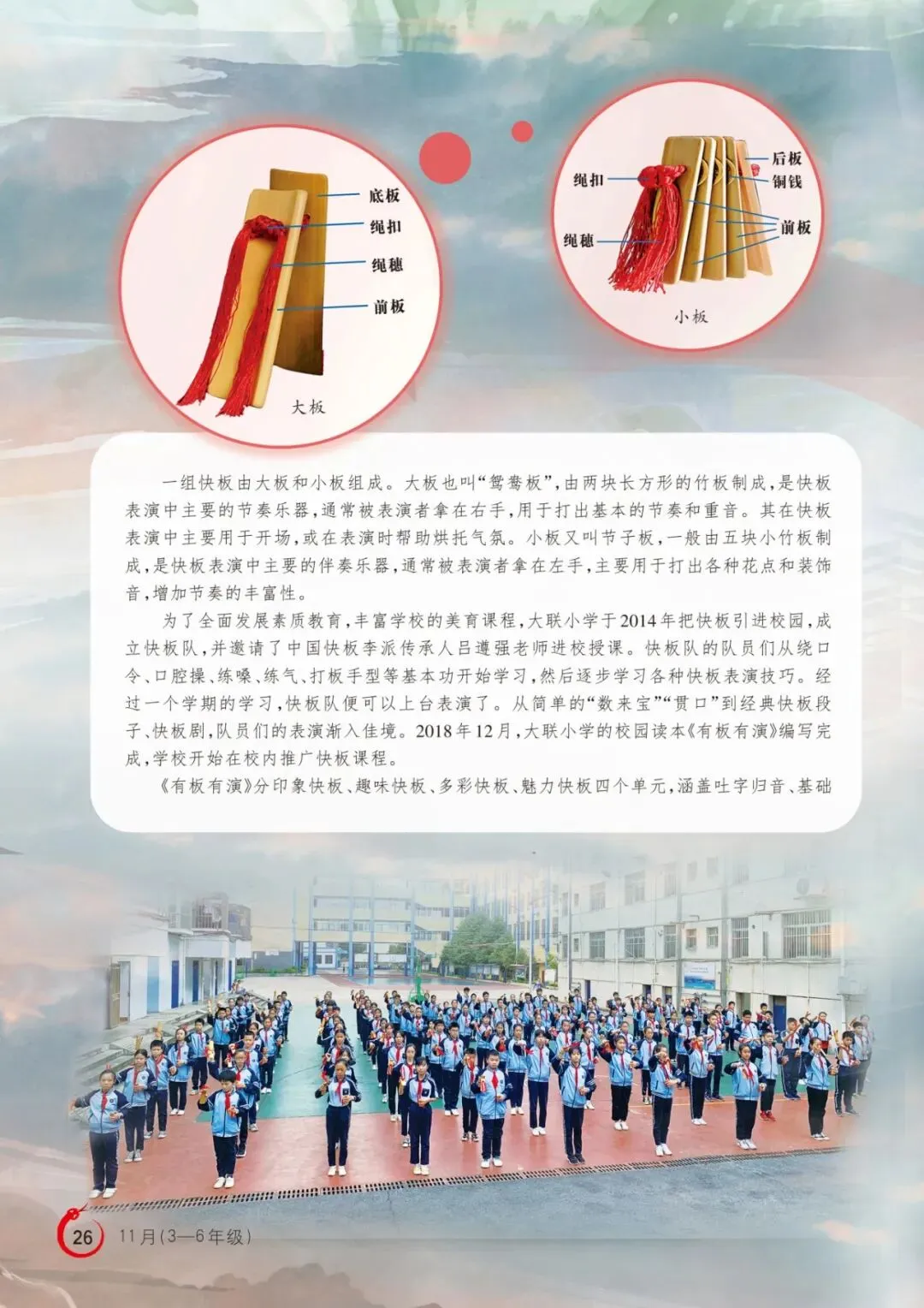 《有板有演》分印象快板、趣味快板、多彩快板、魅力快板四个单元,涵盖吐字归音、基础绕口令、开场板、收板、身段练习等内容。在老师的指导下,学生们从易到难,不但掌握了快板表演的技巧,还学会了创编快板唱词——大家围绕祖国欣欣向荣的发展景象、家乡日新月异的变化、多姿多彩的校园生活、天真烂漫的童年时光,以及中华优秀传统文化的传承、良好行为习惯的养成等主题,创编出不少朗朗上口的快板词。通过创编快板词,学生们不仅感受到了传统文化的魅力,还锻炼了写作能力。