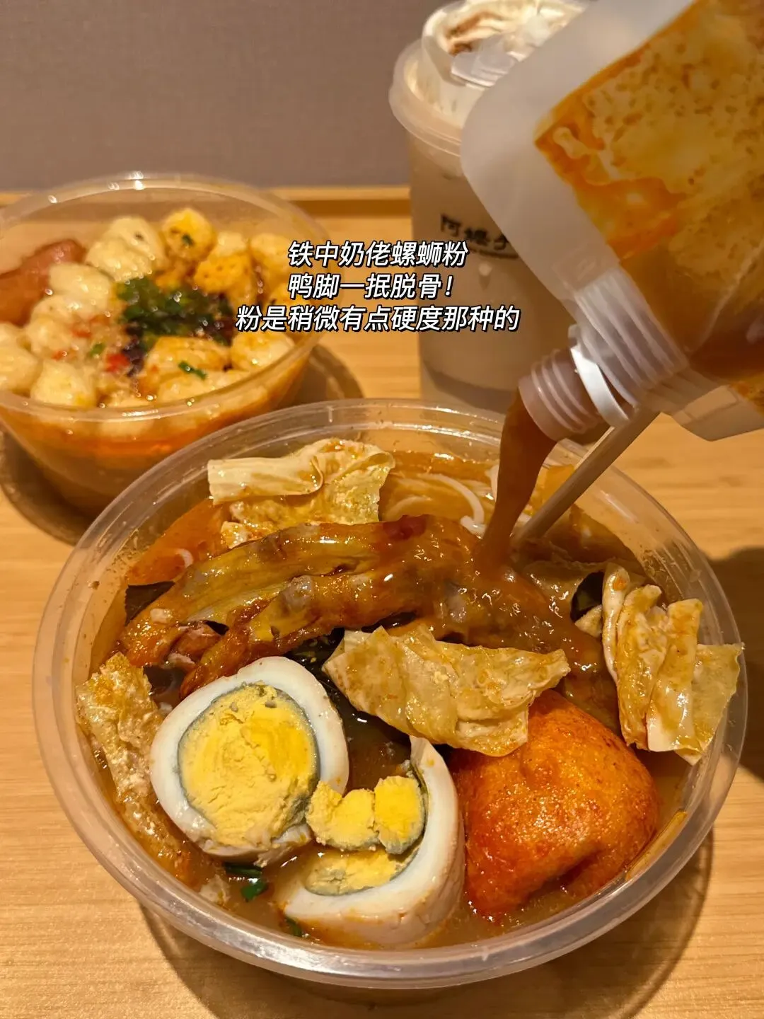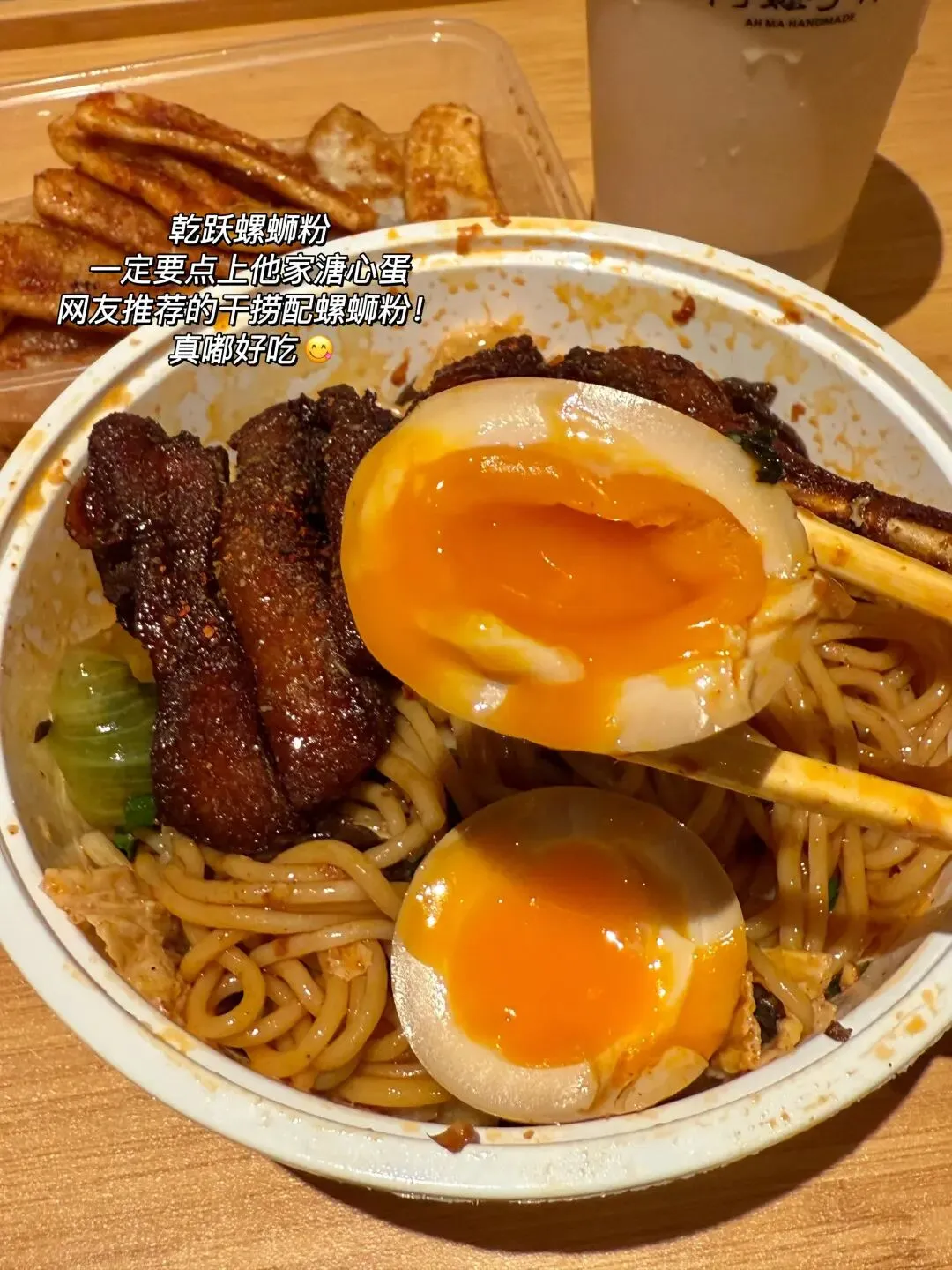 斥巨资点的三样硬菜,每一口都在刷新味蕾认知!首推溏心蛋螺蛳粉,汤底是实打实的螺蛳骨汤熬制,鲜辣醇厚不呛喉,螺蛳的鲜味儿裹着骨香直钻鼻腔。米粉泡得恰到好处,Q弹筋道,每一根都裹满浓稠汤汁,吸溜起来顺滑又过瘾。重头戏溏心蛋必须夸爆,蛋白浸足了汤汁咸香入味,轻轻一咬,橙黄色的蛋黄瞬间流心,与酸辣汤底碰撞出绝妙口感,连吃两个都不腻!