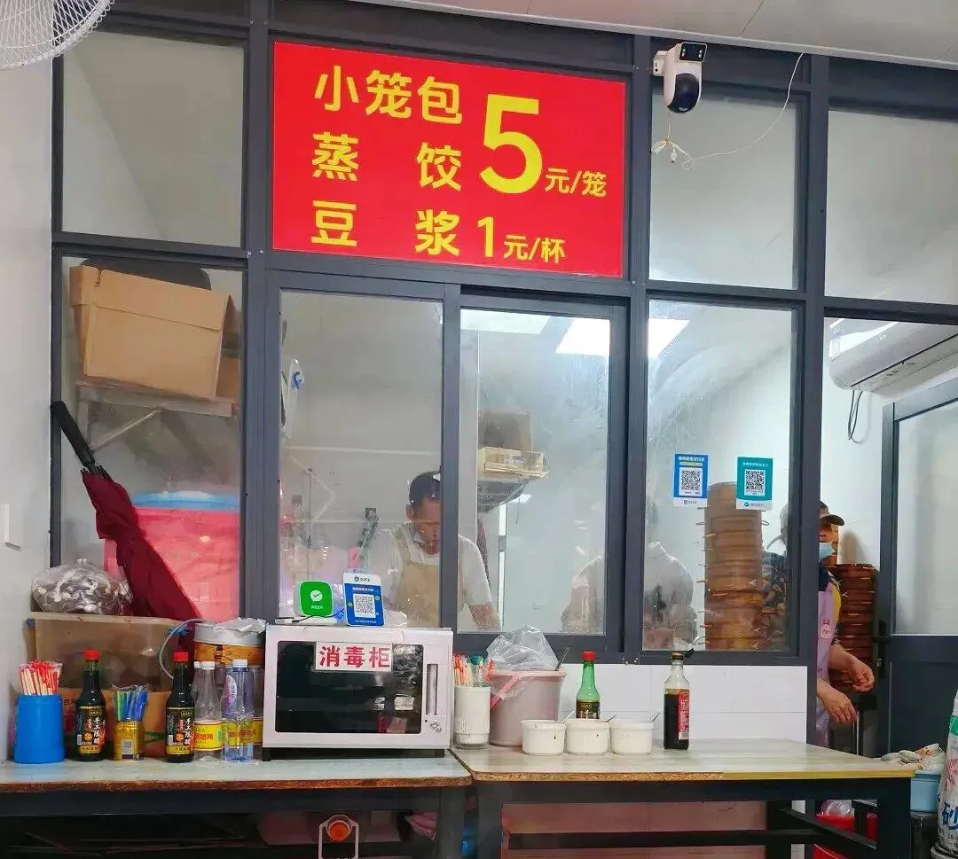 看到了那扇冒着白汽的玻璃窗,还有窗上红底黄字的简易价目表:小笼包5元/笼,蒸饺5元/笼,豆浆1元/杯。