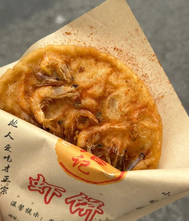 特色推荐:虾饼。 这玩意儿看着粗糙,吃着是真香。面粉调成糊,加上葱花,把鲜活的小虾连壳带肉铺在面糊上,整勺伸进滚油里。只听“滋啦”一声,面糊瞬间膨胀金黄,小虾变得酥脆通红。咬一口,外皮咔嚓响,里面的面饼软糯,虾肉的鲜甜在舌尖炸开,油润却不腻人。